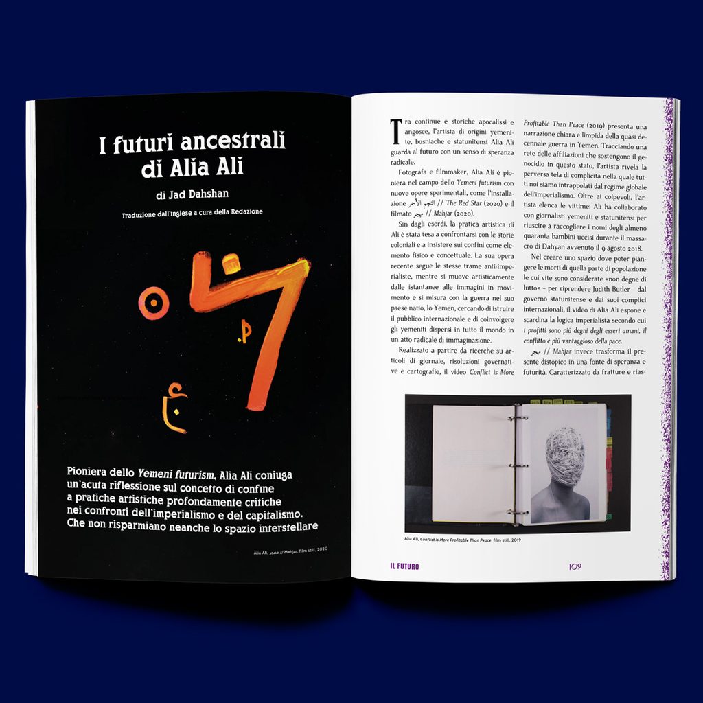 Penso che in “Futuro” si trovino molte indicazioni su quali siano le correnti e le scene più interessanti degli ultimi anni. Per esempio, sono sicuramente degni di nota i futurismi artistici nelle loro varie declinazioni (Gulf futurism, Yemeni futurism, l’afrofuturismo e così via), che producono potenti critiche del colonialismo e del capitalismo, denunciando le contraddizioni che attraversano mondi in cui antichissime modalità di esistenza si trovano gomito a gomito con un presente ipertecnologico. Mentre cercavamo immagini per la copertina, poi, ci siamo imbattute nell’universo dell’arte digitale e degli NFT, che stanno spopolando anche nei paesi arabi e fra gli artisti in diaspora. In letteratura c’è ormai da anni una lunga ondata di produzioni sci-fi, che sono quasi sempre delle allegorie decifrabilissime del presente, prive o quasi di elementi speculativi. Gli scrittori e le scrittrici dei paesi arabi ci raccontano quello che vivono, insomma, usando un linguaggio – quello della fantascienza – che è ormai globale, corrente, alla portata di chiunque.