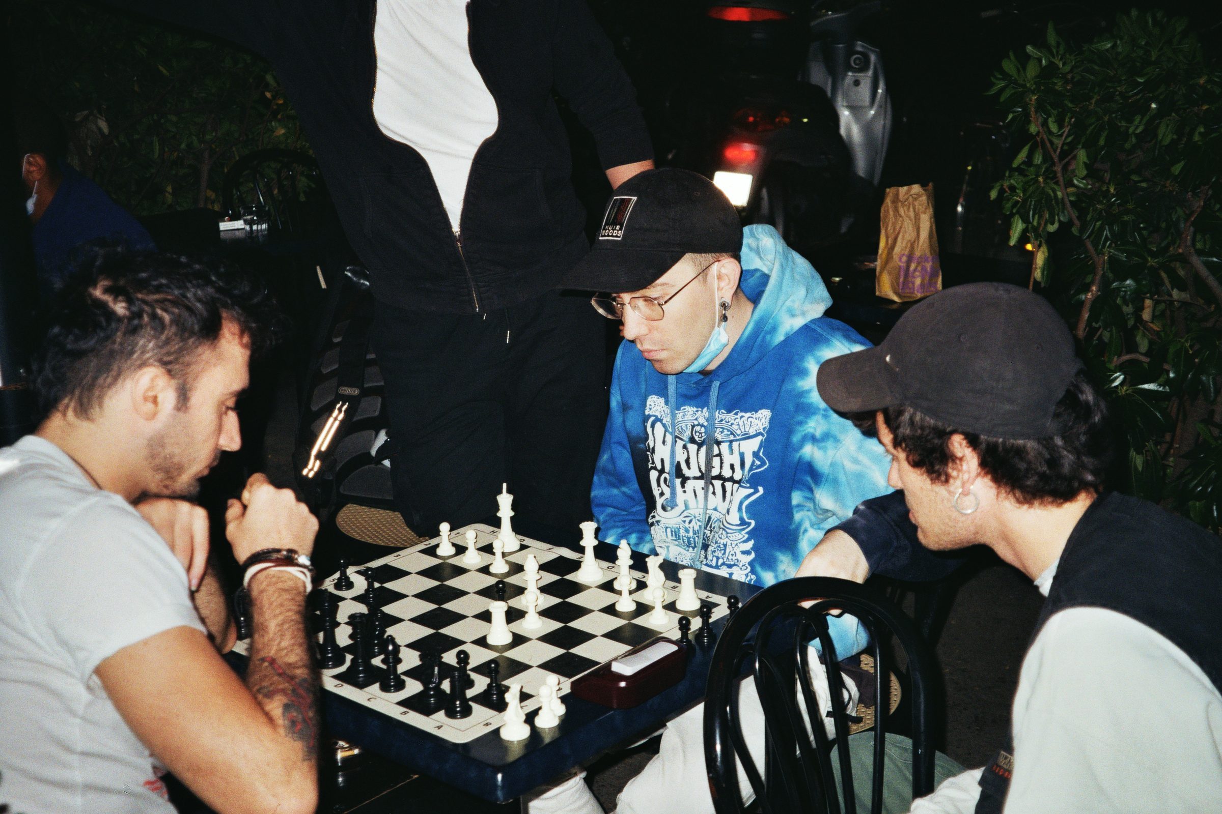 Abbiamo cominciato sei mesi prima che uscisse The Queen Gambit su Netflix, pensa. Quindi poco prima del lockdown. Ci eravamo presi benissimo conoscendo questo negozio di New York, di un rifugiato palestinese, che vende scacchiere e organizza partite 24/7. È un negozio storico in cui vai per bere un caffè e se vuoi ti fermi a giocare a scacchi. Poi eravamo andati in botta con i giocatori di Union Square (New York) e questo collettivo di Los Angeles che si chiama Coffee Chess. Un gruppo di amici che ogni giorno mettono le loro partite su YouTube e trashtalkano di brutto, sono pure molto stilosi, fanno mega ridere. Con quel format ci è venuta l’idea di Blitz At Six.
