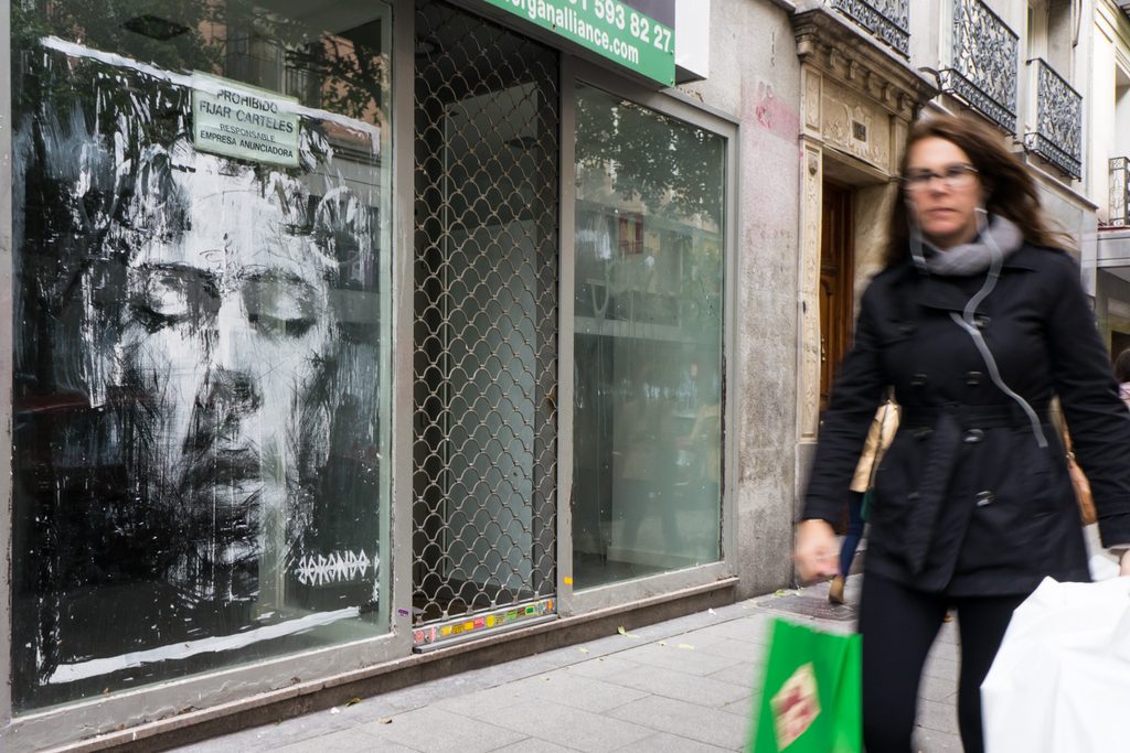 Nel 2003 sono andato a Madrid per fare l’accademia e ho iniziato a dipingere negli spazi pubblici, scoprendo che per me era importante confrontarmi con il luogo, il contesto e chi lo abita. In quegli anni a Madrid stavano chiudendo moltissimi negozi a causa della crisi e quindi c’erano tante vetrine abbandonate. Iniziare a intervenirci sopra è stato naturale, quasi istintivo: volevo evidenziarne la presenza, giocando sulla mancanza e sulla trasparenza. In quel periodo, oltretutto, la polizia a Madrid si faceva sentire e bisognava trovare modi alternativi per continuare ad agire e reagire negli spazi pubblici. La tecnica che ho sviluppato e che chiamo “scratch on glass” si basa su un processo di rimozione, con l’assenza che fa emergere gli elementi della composizione. Dipingo il vetro di bianco, o nero, e poi realizzo il disegno per sottrazione, graffiando la superficie con strumenti tipo raschietti e taglierini, ma anche forchette o qualunque oggetto appuntito e graffiante, ma non abbastanza per graffiare il vetro. Così se viene la polizia non può dirmi nulla: sto pulendo! Quello che amo del vetro è il vetro stesso: un elemento naturale, tanto fragile quanto resistente, protegge ma si vede attraverso, ricco di contraddizioni ed eleganza. Un intervento a cui sono molto legato era qui a Roma, in via Nazionale, dove c’era una banca abbandonata, proprio di fronte al Palazzo delle Esposizioni. Nel 2013, credo, ci ho disegnato sopra tre figure di donna con questa tecnica. Negli anni, passandoci davanti, vedevo che altre persone avevano aggiunto delle scritte che diventavano una sorta di tatuaggi, di impronte spontanee. L’opera è diventata interattiva e in costante trasformazione: mi è piaciuta molto quella evoluzione. Trovo che ci sia una fascino ancestrale nel gesto di sottrarre, di graffiare una superficie, ed è per questo che le persone da sempre, inevitabilmente, continuano a graffiare e a godere della sensazione di scavare e incidere qualcosa, per poi trovare nella “distruzione” la vera creazione. Per quanto possa sembrare un materiale non adatto a realizzare lavori artistici, io non vedo il vetro come un limite, anzi, all’opposto, ci vedo dentro infinite possibilità di scoperta. Inizialmente mi angosciava non comprenderle tutte, ma adesso mi conforta sapere che posso continuare a sviluppare ed evolvere l’utilizzo che ne faccio, per aggiungere contenuti poetici alle mie opere.