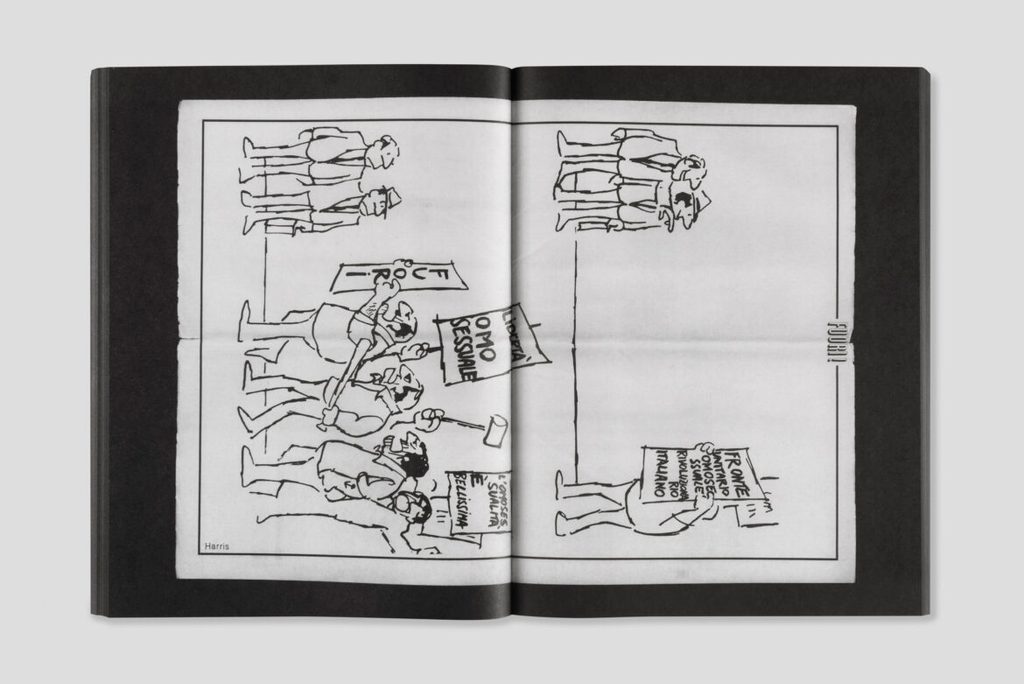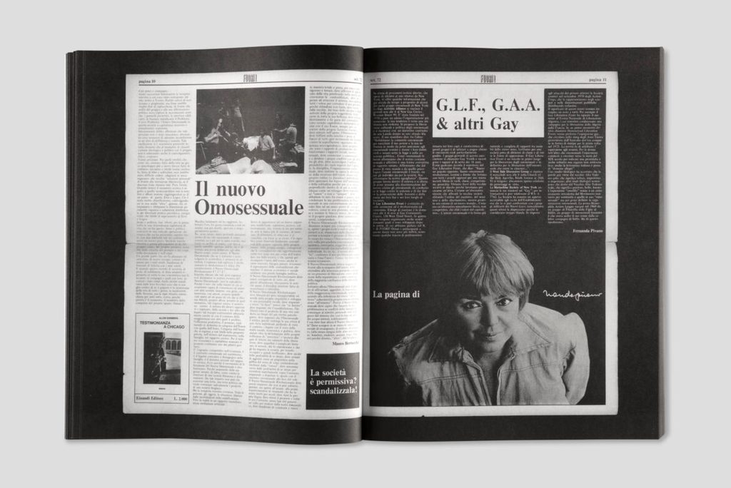 L’unica storia conosciuta all’estero era quella di Mario Mieli, storia che lambisce parecchio il movimento, ma in cui non abbiamo voluto immergerci perché avrebbe aperto ambiti completamente diversi. Questa raccolta contiene del materiale estremamente prezioso e potenzialmente infinito. Nel senso che immergendosi nella lettura si scopre un’immensa eterogeneità di contenuti, dal contributo serio e critico alla vignetta cazzona. Un mix inedito – anche oggi – e anticipatorio disposto in blocco per la prima volta, ed è da qui che arriva l’idea del fuori formato. Di un oggetto per certi aspetti indimenticabile, non foss’altro per il peso. Volevamo che assumesse non l’aspetto sepolcrale dell’antologia “gne-gne”, ma che si proiettasse dentro una categoria alla quale non era invitato proprio, quella dei libri da tavolo. Una folle competizione con Phaidon e Taschen.