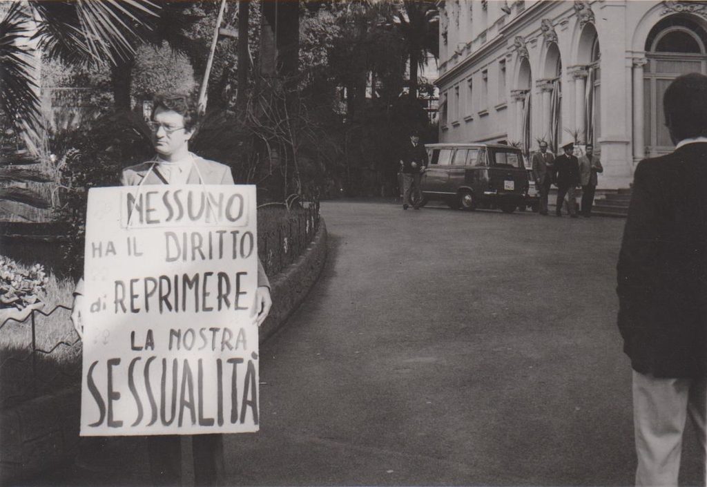 Abbiamo cominciato a capirci veramente qualcosa durante la ricerca, quando abbiamo conosciuto la storia di Enzo Fusco, l’archivista. Una storia molto significativa di una persona che è ancora scossa dalle botte prese in passato e dal tempo trascorso in carcere. Parlando con lui, guardandolo, ci siamo resi conto di come la storia del FUORI! rappresenta soprattutto la storia di un manipolo di persone che davvero ha messo il proprio corpo nella rivendicazione dei propri e degli altrui diritti. Diritti fondamentali per quelli che erano considerati alla stregua di una categoria medica, di “deviati”, “malati” o (termine da sempre fantasmagorico) “invertiti”. Perché il FUORI! nasce dalla definizione diagnostica di un “paziente” e dalla rabbia che è uscita finalmente “fuori”, all’aperto. Nel vedere i risultati di questi schiaffoni, dei calci, dei pugni e della galera, abbiamo realizzato della differenza abissale che separa quella stagione – la nostra Stonewall – dall’attuale situazione di queernorm; un contesto sacrosanto (ci mancherebbe, ma spesso in fondo troppo pacificato) di realizzata acquisizione dei diritti accordati, e forse in qualche caso normativo. E questo non è sufficiente. In primo luogo, di diritti ne mancano ancora molti. Basti pensare all’adozione, o al mobbing che – fuori magari da Milano – nel resto di Italia non è affatto diminuito, e tutto ciò che comporta (vedi la farsa in atto su quello straccio di testo di legge un tempo redatto da Zan). Ma soprattutto, a mancare in questa idea di pacificazione – da un lato benedetta, dall’altra soporifera – è un’idea di trasformazione della società. Di uscita da sé, dai meri diritti individuali.
