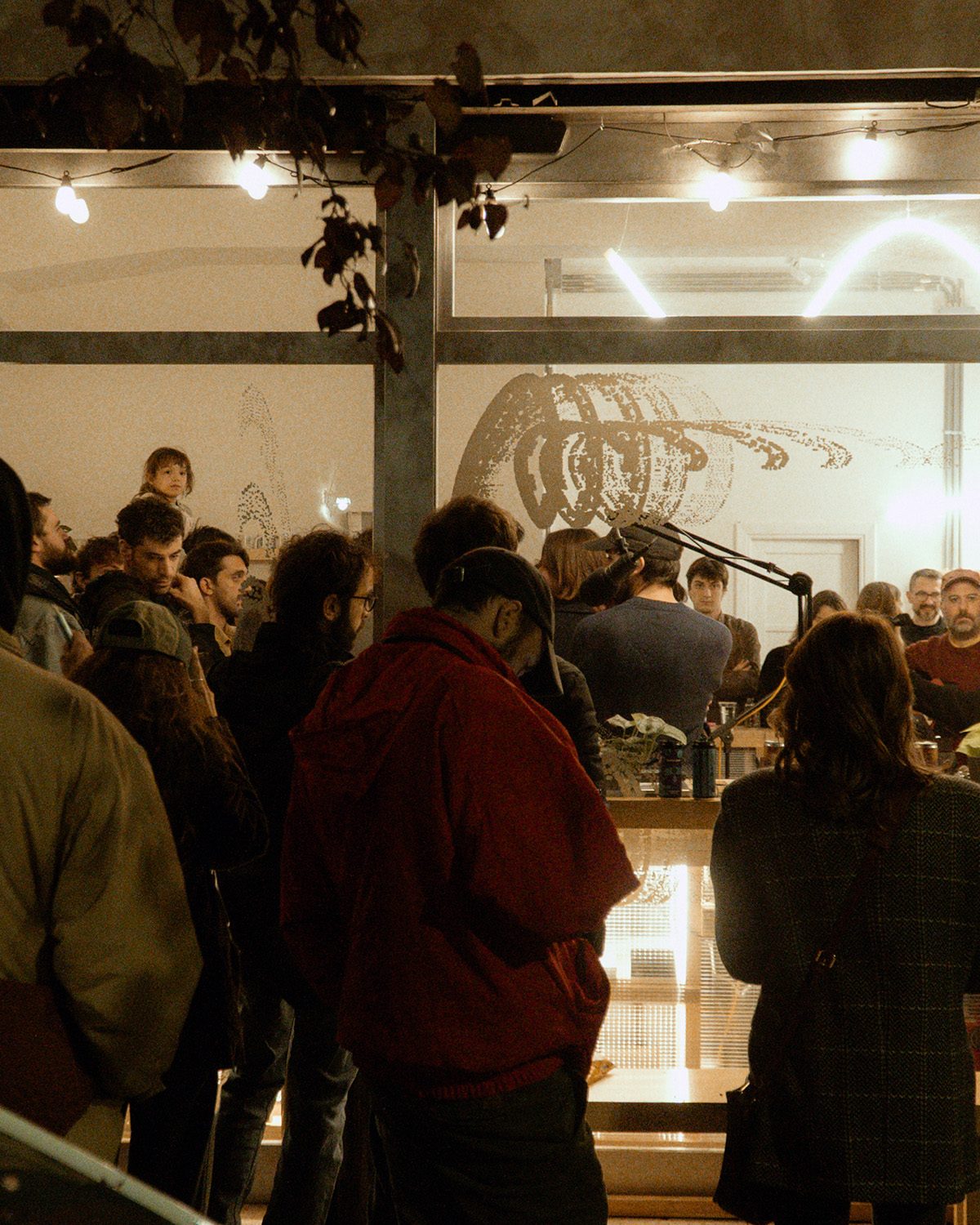 Esatto, io mi sono accorto di questa cosa dopo, quando ho aperto. Ho preso uno spazio quasi a scatola chiusa in una zona che non conoscevo, uscivo qualche volta al Pigneto e basta. È standoci dentro che mi sono reso conto della bellezza, sia proprio estetica e architettonica, sia di come le persone siano un miscuglio tra quartiere e gente che viene apposta. Anche quando abbiamo fatto degli eventi con tanta gente, c’è sempre questo mix molto bello di aficionados che non se ne perdono una a prescindere e gente portata nello specifico da chi c’è quel giorno. Quindi non si crea mai veramente la situazione da bolla che conosciamo bene, quella delle solite trenta persone nei soliti luoghi. Sicuramente anche l’estetica e la forma del posto aiuta nel regolare un certo tipo di frequentazione e di rispetto anche per il vicinato. Mi capita spesso di frequentare luoghi in cui le aspettative sono totalmente diverse da quello che in realtà poi succede. Una cosa che finisce per mettere a disagio in primis l’artista, poi il proprietario e infine il pubblico. Chi passa da Rhizome è molto consapevole invece di dove si trova. Poi chiaro passano anche le signore, ogni tanto apre la porta gente a caso che mi chiede “ma che è ‘sto posto”. Io a quelli rispondo sempre che siamo una pizzeria.