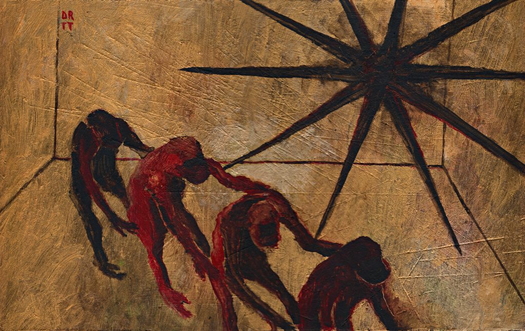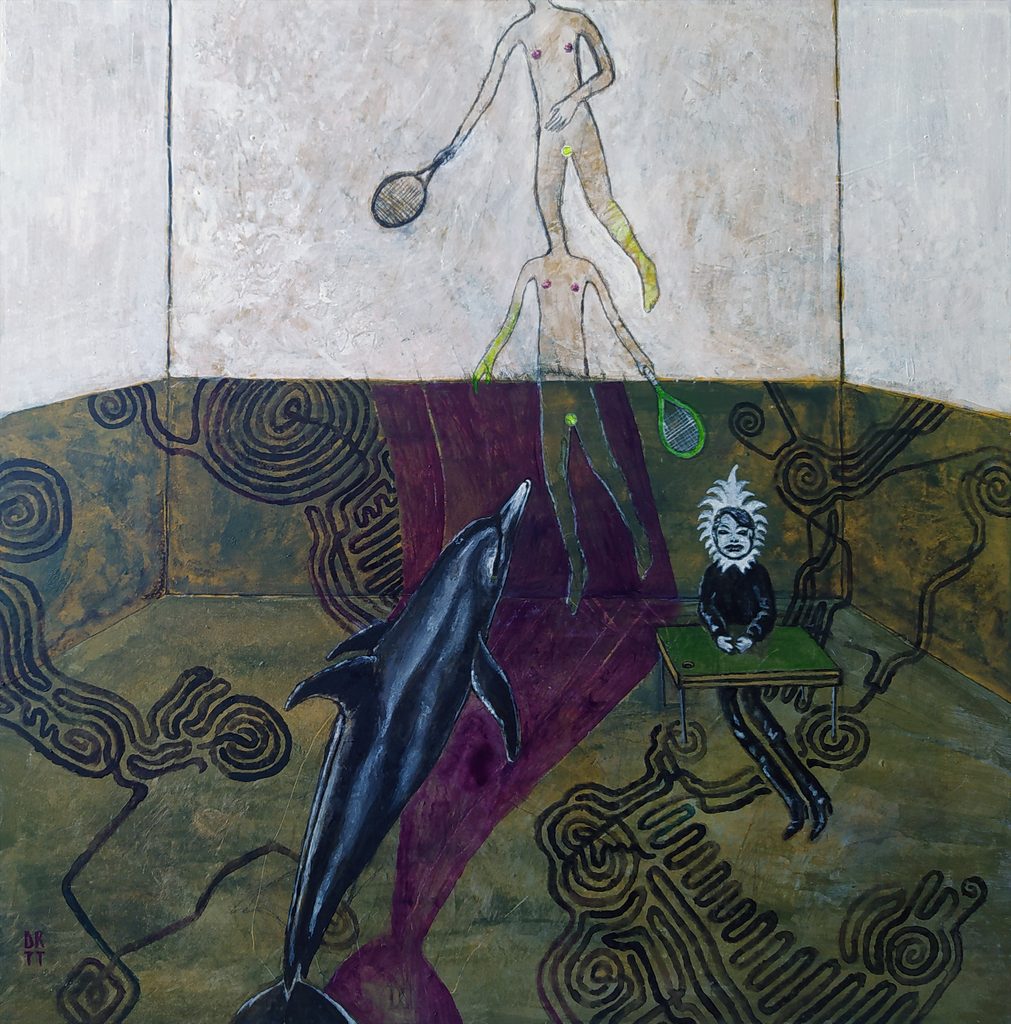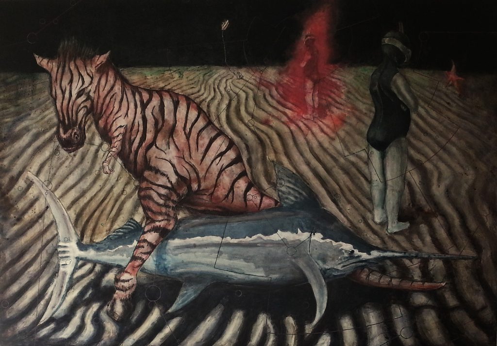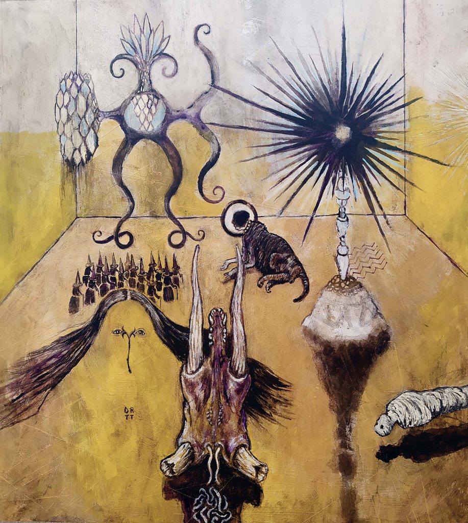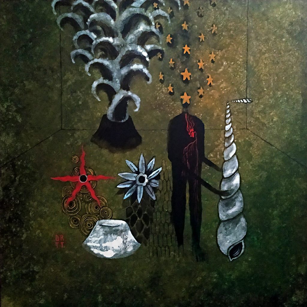 Alla mostra a cui sono stato invitato porterò un quadro eseguito quest’anno in un solo pomeriggio. Ecco, la rapidità di esecuzione è già un evoluzione di per sè. Sono passato da ambientazioni esterne, linee d’orizzonte con elementi “traccia” a volte allineati in primo piano, agli interni. Interni che chiamo “Stanze”, concepite come Celle, nell’accezione informatica del termine, in cui assisto, quasi come uno spettatore neutrale, il disporsi in elegante equilibrio di figure cangianti e multiformi. Celle quindi dove si materializza la creazione, racchiusa come una divinità nel tempio. Celle come approdi.