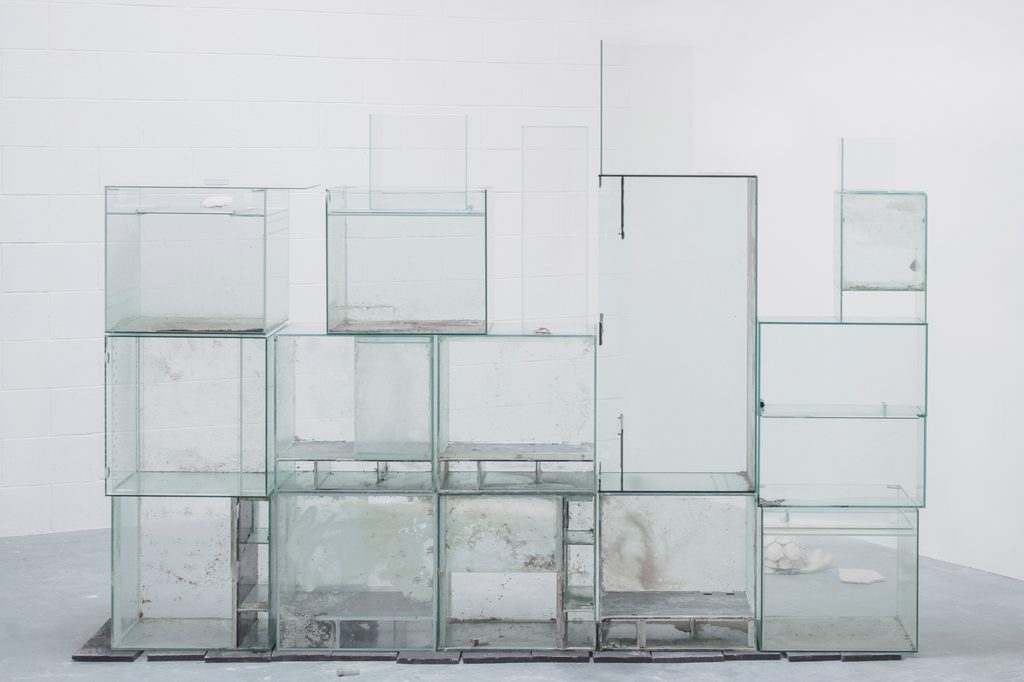 Quel gruppo di teche incrostate (un insieme di vetrinette accumulate quasi a formare un enorme soundsystem trasparente, ndr) erano i terrari che avevo a casa quando ero ragazzino, in cui allevavo insetti, rettili e bestie di vario genere, che poi avevo smontato quando sono partito per Londra. Erano rimaste in una stanza, ma sono rimaste le tracce della terra, dell’acqua, dei mondi che contenevano. Oltre agli originali, ho anche delle copie di questi terrari che ho costruito riproducendo artificialmente i segni di un contenuto che non c’è mai stato, producendo di fatto contenitori slegati dalla loro funzione. Poi ci sono i calchi in gesso dei perimetri (di stanze, di case in cui ho vissuto o a cui ero legato) o di elementi di cantiere, come le lamiere ondulate. Sono frammenti spazio-temporali.