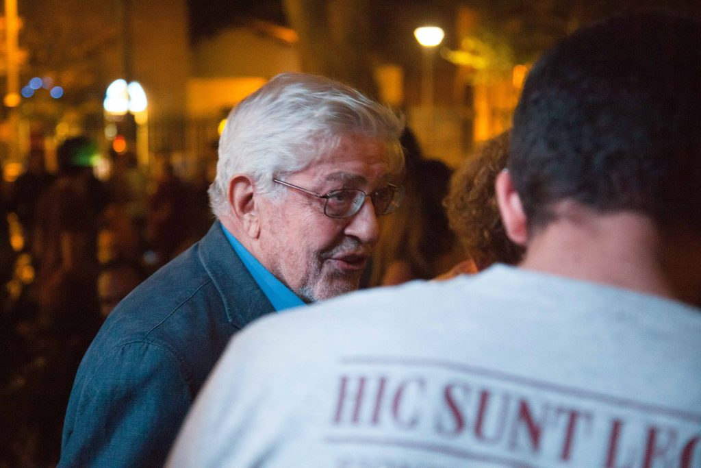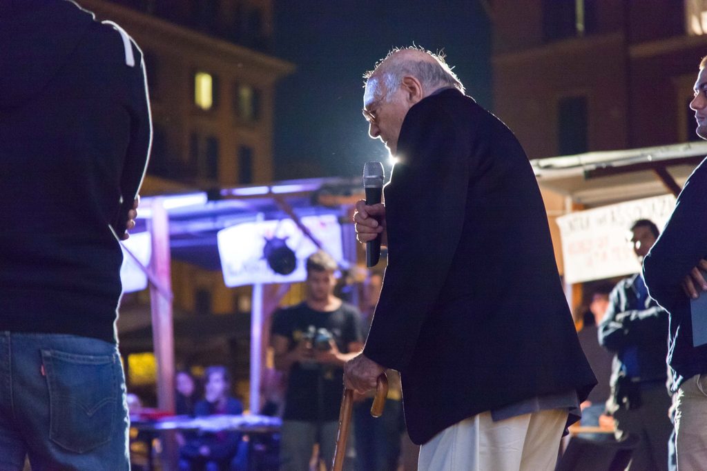 Valerio Carocci: Ricordo che avevamo realizzato una locandina con Alberto Sordi nei panni del Marchese del Grillo, immagino sia stato quello il film. Quella prima proiezione risale all’estate del 2014, poi c’è stata una seconda arena dopo lo sgombero. L’idea di andare in piazza è nata dentro l’occupazione del Cinema America e partiva dalla volontà di tornare a San Cosimato, perché li avevamo incontrato i residenti per poi entrare nel cinema. Ovviamente, gestendo uno spazio occupato, tra lavori e ristrutturazione e quant’altro ci eravamo chiusi all’interno e non riuscivamo a fare niente all’esterno. Quindi il nostro primo obiettivo è stato quello ritornare a vivere la piazza assieme ai residenti. Nel momento in cui c’è stato lo sgombero le cose sono cambiate e ci siamo posti il problema di presidiare l’immobile con una sorta di occupazione dall’esterno, in piazza per l’appunto. Raccontammo bene questa idea quando venne a trovarci Benigni. I primi ad arrivare in piazza furono Scola, Garrone, Rosi: quello è stato il primo Cinema in Piazza come lo conosciamo oggi, con ospiti importanti. Quel primo anno ci fu una proiezione speciale di “Uomini contro” di Francesco Rosi che è sempre molto divertente da raccontare. Rosi lo invitammo dicendo che in piazza ci sarebbe stato anche il Presidente Napolitano e, contemporaneamente, invitammo il Presidente dicendo che ci sarebbe stato Rosi, ma nessuno dei due aveva confermato sul serio. Alla fine Rosi ci diede l’ok e Napolitano, ovviamente, non venne. Il Presidente però ci mandò una lettera e Rosi fu molto felice di trovarla al sua arrivo. Siamo stati fortunati perché avevamo completamente bleffato! Rosi lo andammo a prendere in macchina, una volta arrivato davanti il cinema ci disse: “ma questo cinema è chiuso, chi lo gestisce?”. Gli dovemmo ri-ri-spiegare tutta la storia, ma in generale fu molto contento, tant’è che dopo quel momento, che è stato anche la sua ultima apparizione pubblica, continuammo a sentirci perché voleva aggiornamenti sulla situazione. Anche Scola ci chiamava: salvare il Cinema America per loro era diventata una partita politica divertentissima. Poi ogni tanto discutevano perché avevano posizioni diverse e a me toccava mediare. (Il primissimo titolo proiettato è stato “Barricata San Calisto” di Ivano De Matteo, “Il marchese del Grillo” è stato il secondo, nda).