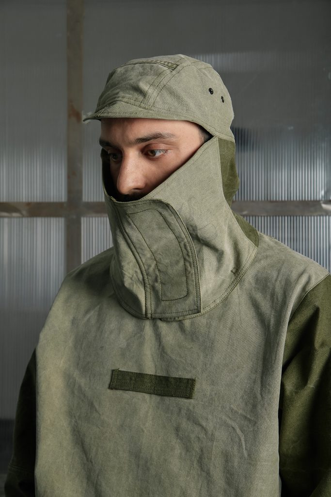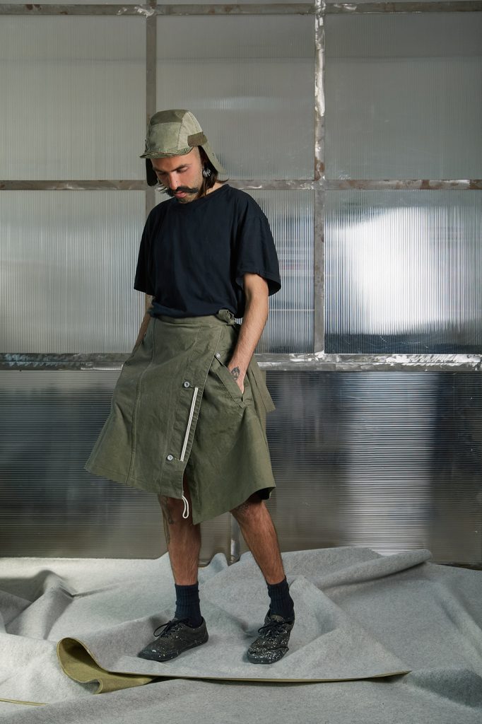 Il mio progetto è nato per decontestualizzare tutto ciò che è guerra. Raramente creo capi custom. In generale lavoro con enormi teloni degli anni ’30/’40 e ’50. Non è un tessuto convenzionale e mi piacciono perché conservo tutto, scritte, timbri, tagli, bottoni. All’inizio ho deciso di lavorare solo con teloni degli eserciti russi, polacchi, americani e di utilizzarli per creare capi ispirati ai worker di strada giapponesi. L’idea è anche decontestualizzare i conflitti tra queste nazioni e valorizzare quella cultura. La prima produzione è stata fortemente caratterizzata da questa influenza giapponese: kimoni e gonne, tutto rigorosamente no gender. Sono tutti pezzi unici, non conservo nulla in archivio. Parliamo di teloni che in fondo non sono né miei né di chi me li ha dati, piuttosto di chi li ha utilizzati per ripararsi. Negli stessi termini, mi piace pensare che ciò che ne deriva non mi appartenga più, che vada a qualcun altro. Mi rimane solo la foto. Mi piace perché fin da ragazzino ho sempre fatto graffiti e una canzone recitava: “La fotografia è il 50% del nostro gioco. Se fai un graffito su un treno e il giorno dopo quel treno parte, non ti rimane che la foto”. Lo stesso concetto lo applico a quando realizzo un capo.