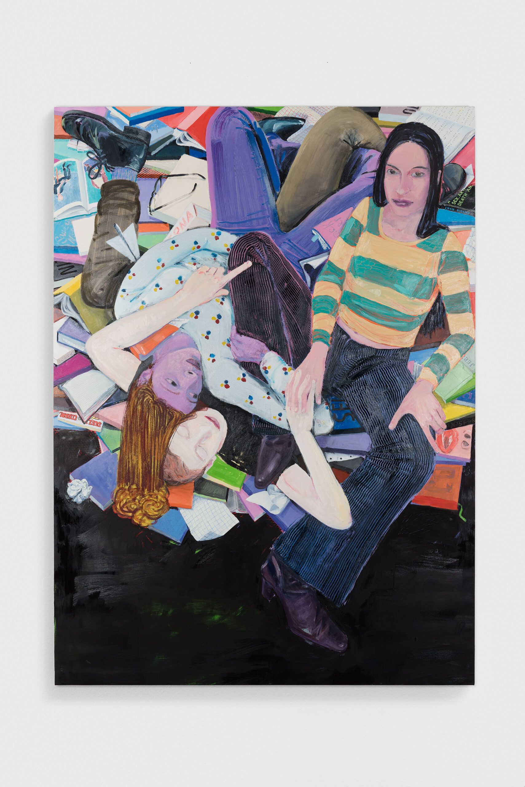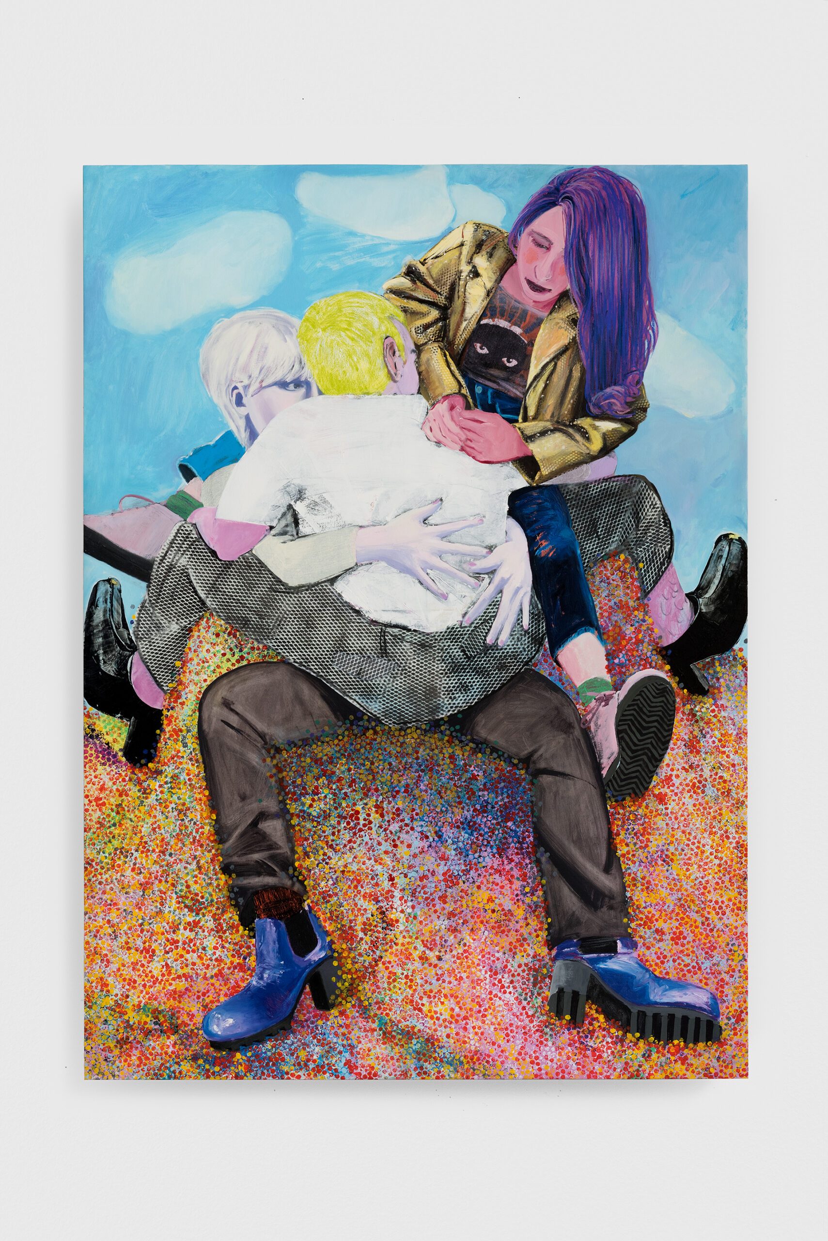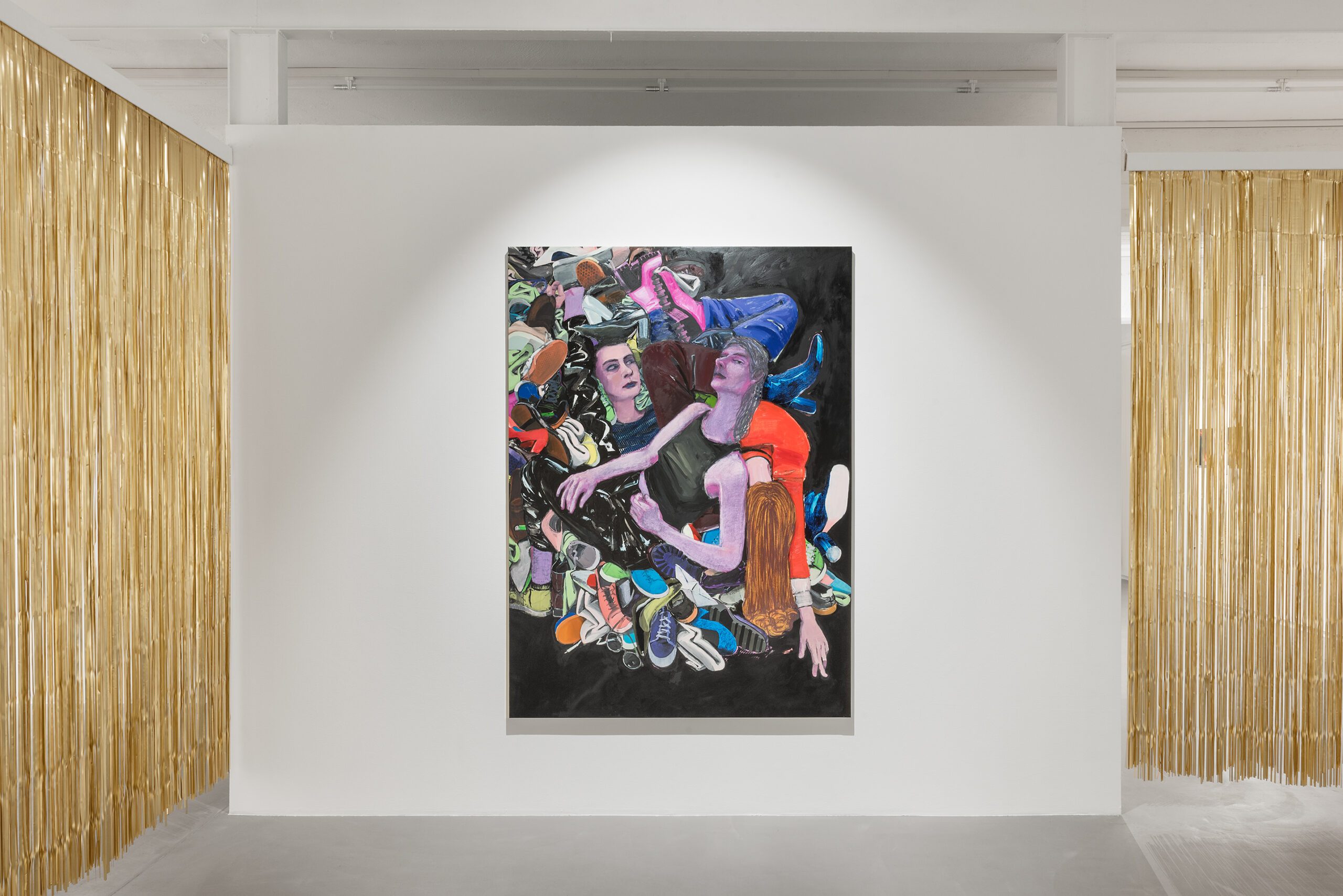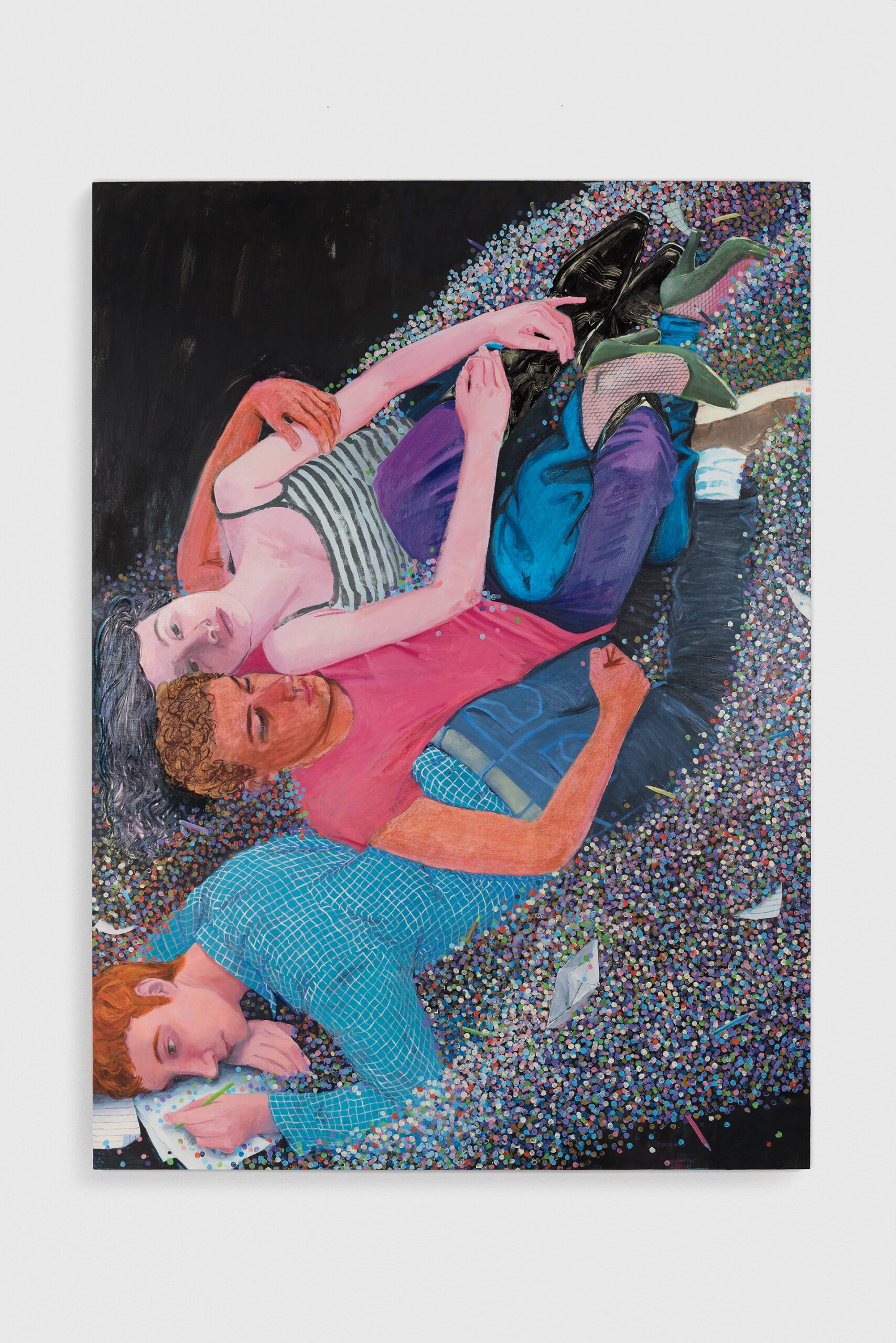 La pittura per me è anche un atto relazionale e di osservazione metaforica del mio contorno più stretto e di più lunga data. Prima di iniziare un quadro mi ritrovo con qualche amico nel mio studio: loro mi forniscono l’ispirazione semplicemente essendo loro stessə, in relazione fisica lə unə con lə altrə. Dipingo scene con riferimenti all’infanzia, sia per gli oggetti presenti che per, in alcuni casi, la varietà delle gestualità messe in atto. Secondo la psicanalisi il tatto è il primo senso a metterci in contatto con il mondo, prima ancora del verbo e, dunque, con l’altro. Eppure nelle relazioni manca spesso questo approccio, fisico e innocente al tempo stesso, che mi interessa indagare tramite la mia pratica artistica. Ovviamente vuol dire anche ragionare sulla pittura stessa.