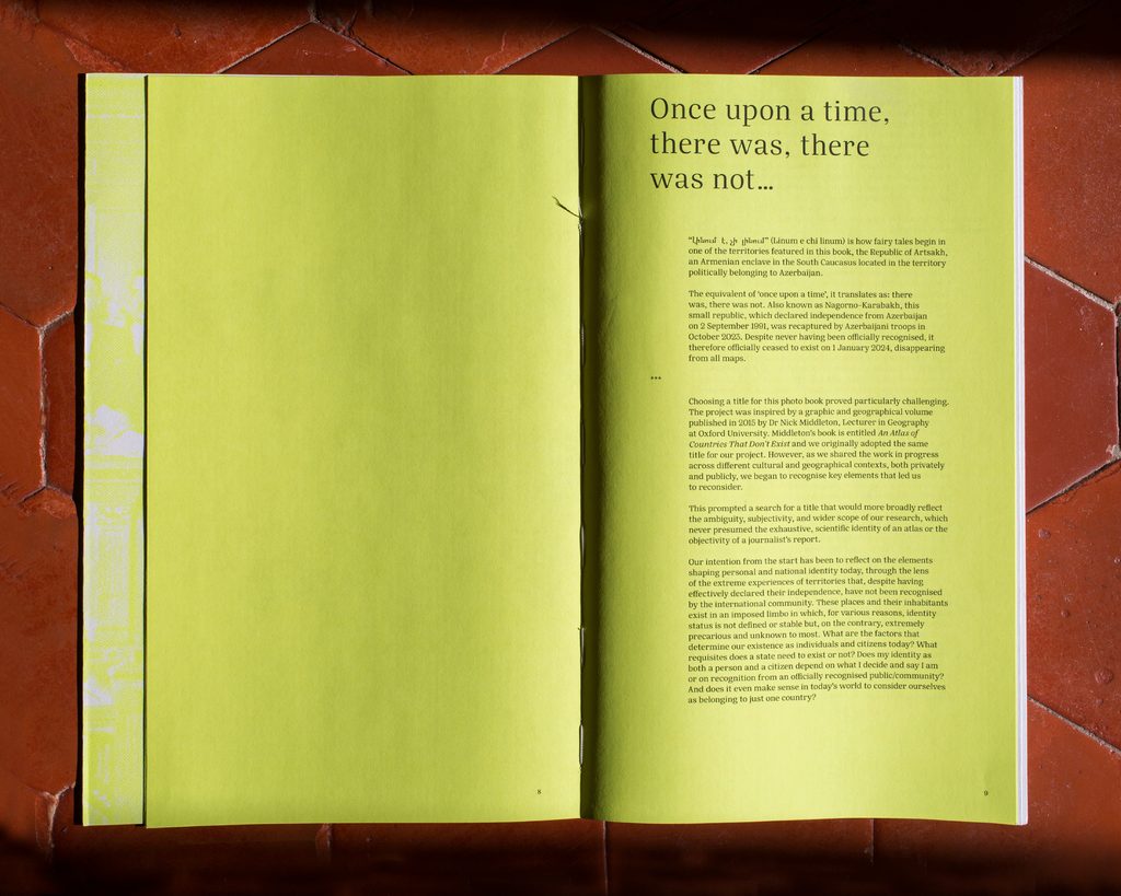 I due fotografi, entrambi romani di origine, hanno viaggiato in luoghi reali ma che ufficialmente non esistono. Paesi che non lo sono, non riconosciuti. Cinque luoghi: la Repubblica Moldava di Pridnestrovia (PMR, comunemente nota in Occidente come Transnistria), la Repubblica di Catalogna, la Repubblica di Artsakh, la Repubblica Turca di Cipro del Nord (TRNC) e la Repubblica Democratica Araba Saharawi (RASD).