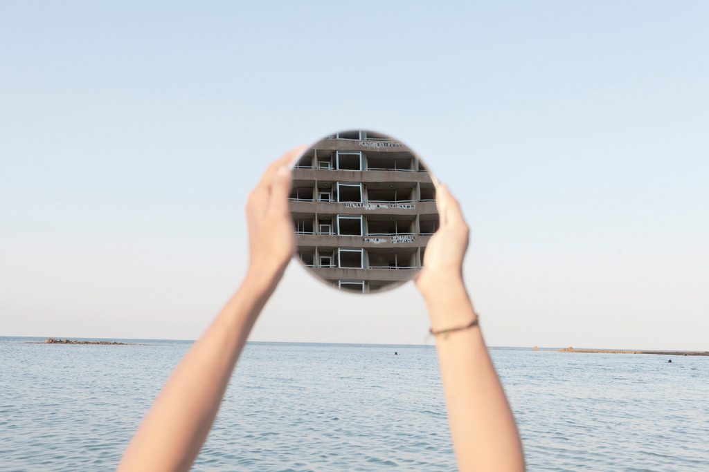 LP  & MP: Pensiamo ad un’immagine che sarebbe divenuta un corollario al libro, una cartolina che sul finale avremmo voluto inserire al suo interno. Si tratta di una fotografia di Varosha oggi. Avevamo già fotografato questa città nel 2017, si tratta ancora una volta della fotografia dello specchio tondo con il riflesso dei palazzi. Varosha (in turco Maraš), era una famosa località turistica di Cipro del Nord vicino Famagosta. A seguito della divisione dell’isola è stata occupata dall’esercito turco che ha costretto la popolazione a trasferirsi altrove e l’ha trasformata in una città fantasma protetta da lamiere e filo spinato e sorvegliata giorno e notte dai militari. Un luogo inaccessibile e infotografabile per quarantacinque anni, dal 1974 al 2021. Per questo nel 2017 l’abbiamo fotografata attraverso quello specchio, per non farci vedere dai militari. Dopo la pandemia i governi di Ankara e Nicosia Nord hanno deciso di riaprirne un settore, trasformandola in un’attrazione turistica, e noi l’abbiamo visitata poco prima di stampare il libro. La foto-cartolina avrebbe mostrato la situazione oggi e restituito quell’effetto di grottesco stupore che avevamo provato noi di fronte a quella disneyland della storia recente. Alla fine pero abbiamo deciso di non inserirla, perchè il libro era già sufficientemente complesso per come era e sarebbe stato un livello di racconto in più che non abbiamo ritenuto così necessario.