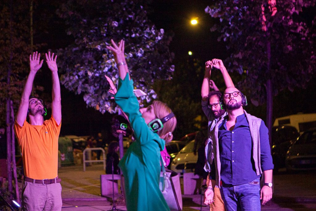 Nasce anche come vocazione per la performance intesa come spostamento nello spazio pubblico che porta con sé il mondo del suono, che rischia sempre di restare l’elemento più trascurato nell’ambito performativo. Solitamente l’aspetto musicale è inferiore rispetto a quello di danza e movimento, mentre per noi l’esperienza del suono è importante e rimane importante e si apre a pratiche diverse.