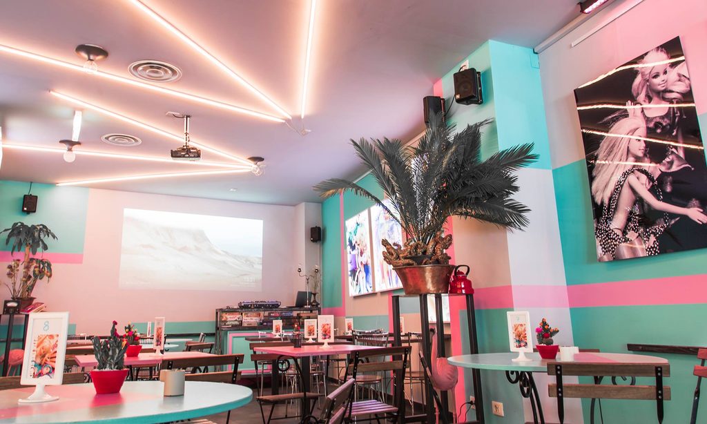 La mia idea era di creare un locale stile anni 80, con quel tipo di mood: le pareti rosa e blu Tiffany, i neon dei club fumosi. A parte questi riferimenti avevo anche in testa un bar dove tutti si sentissero a casa, uno spazio dove esporre (NoLo.So propone anche mostre e incontri culturali) e dove esporsi, senza distinzioni, come d’altronde è questa zona che amo tantissimo: NoLo.
