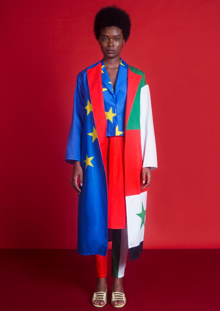 Peggio, ero in costiera! Mi ha un po’ devastato, soprattutto perché sono dovuto rimanere fermo dopo un anno bellissimo. Nel 2019 avevo trovato un mio showroom a Parigi e un altro a Tokyo, dove avevo portato la collezione Immigrant o I’m migrant, che nasceva da tutto il razzismo che si leggeva e sentiva ovunque. Era il momento di Carola Rakete, e mi feci tutta una ricerca sugli italiani che emigravano nel Novecento, mettendoli a confronto con i migranti di oggi. Non cambia un cazzo di niente. Anzi, mi sono trovato delle cose in Canada, in francese, davanti ai bar o ai negozi: Vietato ai cani e agli italiani. Oppure manifesti di Lincoln che spara, di italiani che escono dai reflussi delle barche, assassini, e quindi ho provato a fare questo esperimento, ed è finito a Parigi e a Tokyo. Erano le mie prime cose, e la mia autostima stava salendo vertiginosamente, devo dirlo. E poi la pandemia mi ha fatto saltare una stagione, quella di settembre. Ora sono su questa piattaforma, AltaRoma Showcase, e sto lavorando a un’uscita per l’autunno.