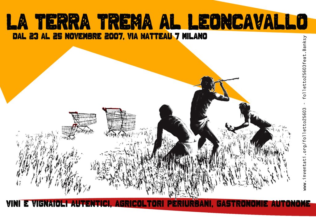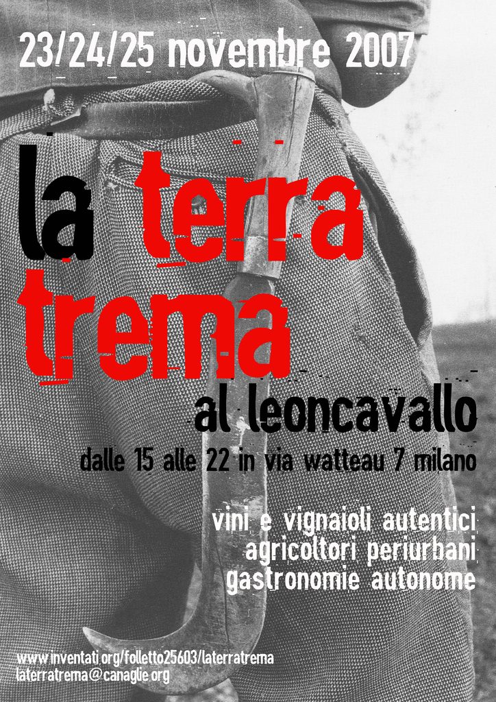 riflessioni intorno ai temi del cibo, della gastronomia, dell’agricoltura, sulla distribuzione, il consumo, le filiere, gli organismi geneticamente modificati, le relazioni sensoriali e gustative, il sapere e i sapori, il prezzo sorgente, l’autocertificazione, la co-produzione. Si elaborano proposte e progetti, manifestazioni e incontri mai visti prima in Italia e in Europa. Ma arriva anche a un punto in cui il connettivo nazionale t/Terra e libertà/Critical Wine deflagra, per ragioni diverse, una buona per ognuno dei protagonisti di quella straordinaria storia. In noi, matura forte il desiderio di dare continuità e allo stesso tempo di sciogliere il vincolo. È così che, a partire dall’esperienza e dalle relazioni maturate negli anni precedenti, Leoncavallo e Folletto25603 decidono di portare La Terra Trema a Milano con la prima edizione del 2007.