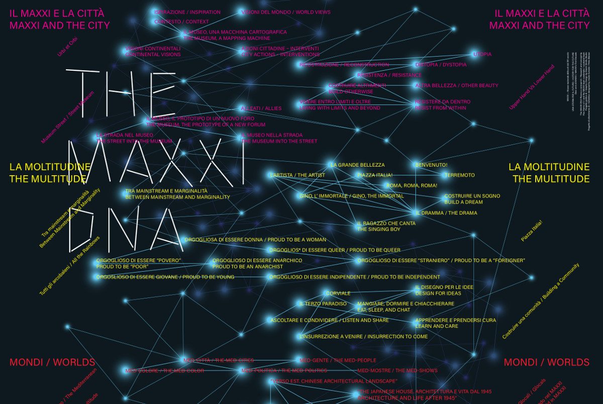 Sì, l’idea della mostra è stata proprio quella di creare tre diversi sistemi di racconto. Il primo è “normale”: una timeline che va dal 2010 al 2020 in cui sono elencate tutte le mostre, le acquisizioni e gli eventi pubblici ospitati dal MAXXI, alla quale si affiancano una serie di immagini fornite dall’Ansa che riportano, per ogni anno, quindici eventi importanti per l’Italia e per il mondo, costruendo così un racconto parallelo. Poi, ispirandomi ad Aby Warburg e Malraux, ho lavorato quasi un anno per creare una mappa, un atlante che raccontasse attraverso cinque grandi temi la programmazione del museo in relazione al mondo: “Il MAXXI e la Città”, “La Moltitudine”, “Mondi”, “Le Sfide della Realtà” e “Credete nell’Innovazione?”. Questi primi due sistemi si sviluppano lungo uno spazio lineare che è pensato come fosse una strada e gioca sui colori nero e bianco, mentre ai lati si aprono quattro stanze di contenuto e colore diverso: la rossa è dedicata all’archivio, con interviste ad artisti e curatori; la blu è un ambiente immersivo dove sono proiettate le mostre ospitate dal museo; la bianca è una sala lettura; nella stanza gialla, infine, ci sono delle interviste video in cui tutti i membri dello staff espongono la propria visione del museo. Quindi abbiamo un racconto pubblico lineare e poi una narrazione della storia del museo sotto cinque temi, che per me è essenziale per definirne l’identità e il ruolo in questi primi dieci anni, così come la visione per il futuro. Abbiamo anche creato un poster – che il pubblico può prendere gratuitamente – dove sono presenti tutti i temi della narrazione: si chiama The MAXXI DNA e ci sono tutte le risorse di ispirazione e di pensiero, rappresentate come fossero un codice genetico, un albero che cresce o una costellazione.