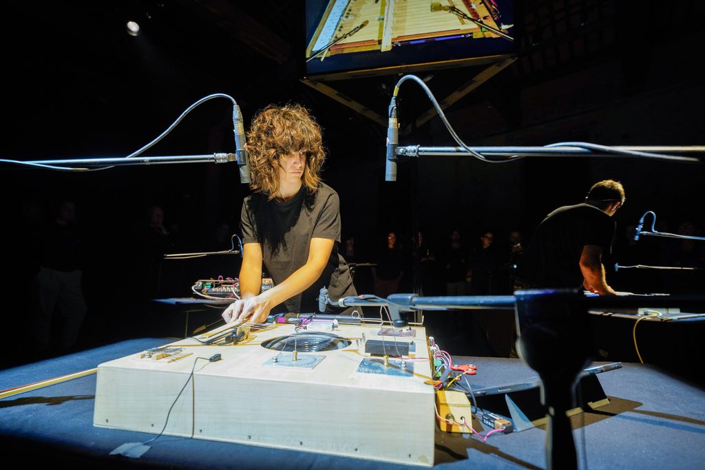 FM: Machines Inside Me è un brano di 20 minuti per tre strumenti auto-costruiti elettromeccanici e due performer. Tra il 2022 e il 2023 ho iniziato a sviluppare questi tre strumenti; mi sono occupato della progettazione, dello sviluppo dell’hardware e del software per farli funzionare. Con l’aiuto di mio padre Alessandro (che è un falegname) ho realizzato i primi prototipi delle componenti in legno, i quali sono poi stati modificati e migliorati fino a raggiungere le versioni finali. Più o meno nell’aprile del 2023 sono arrivato alle versioni finali degli strumenti che avevo costruito, i quali avevano acquisito tutte le caratteristiche e le qualità sonore che stavo cercando per la composizione del brano. La caratteristica che salta subito all’occhio (o all’orecchio) è che ci sono due performer e tre postazioni con tre strumenti: uno di questi infatti è completamente automatizzato, o come dico di solito “si suona da solo”. Gli altri due sono automatizzati al cinquanta per cento e quindi utilizzati dal performer umano. Durante l’esecuzione del brano le componenti elettromeccaniche automatizzate degli strumenti realizzano una performance, la quale è costantemente orchestrata e variata in tempo reale dai performer umani (in questo senso i ruoli sono invertiti rispetto a quello che succede di solito). Il titolo del brano è piuttosto didascalico, cosa a mio avviso positiva in questo caso, nel senso che definisce precisamente ciò che si vede e ne propone una chiave di lettura che, per quanto basilare possa essere, ritengo sia sufficiente per una comprensione minima dell’opera. Lo si deve interpretare non come se fosse detto dall’autore (non si tratta delle macchine che sono dentro di me come persona), ma dai protagonisti sonori del brano, ossia gli strumenti stessi. All’interno degli strumenti si trovano infatti tutte le macchine che ne permettono il corretto funzionamento, l’amplificazione, la produzione e il filtraggio sonoro, ecc…
