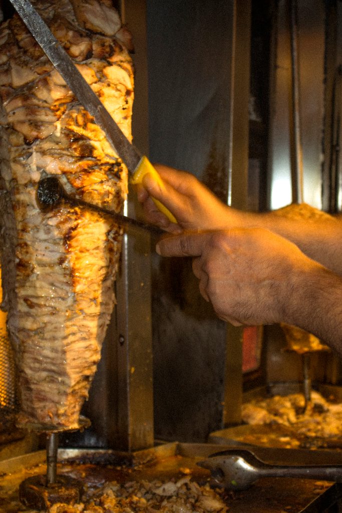 Esatto, non c’entra niente. Questo è il metodo egiziano. Quello turco gira sullo spiedo, quindi si cuoce solo con il fuoco che sta dietro allo spiedo. Il nostro invece fa una precottura sopra e c’è una piastra sotto che finisce di cuocere la carne una volta tagliata. L’altra differenza è che noi lo tagliamo a mano, mentre tutti gli altri lo tagliano con la macchinetta. Questo perché quando lo compongono ci buttano un po’ tutto e l’effetto finale è che la carne è tutta sbriciolata. Difficile trovare dei pezzi di una certa grandezza. Oltre al kebab abbiamo poi tanti altri piatti: felafel, cous cous, etc. Diciamo che la nostra è una cucina arabo-mediterranea, di stampo egiziano.