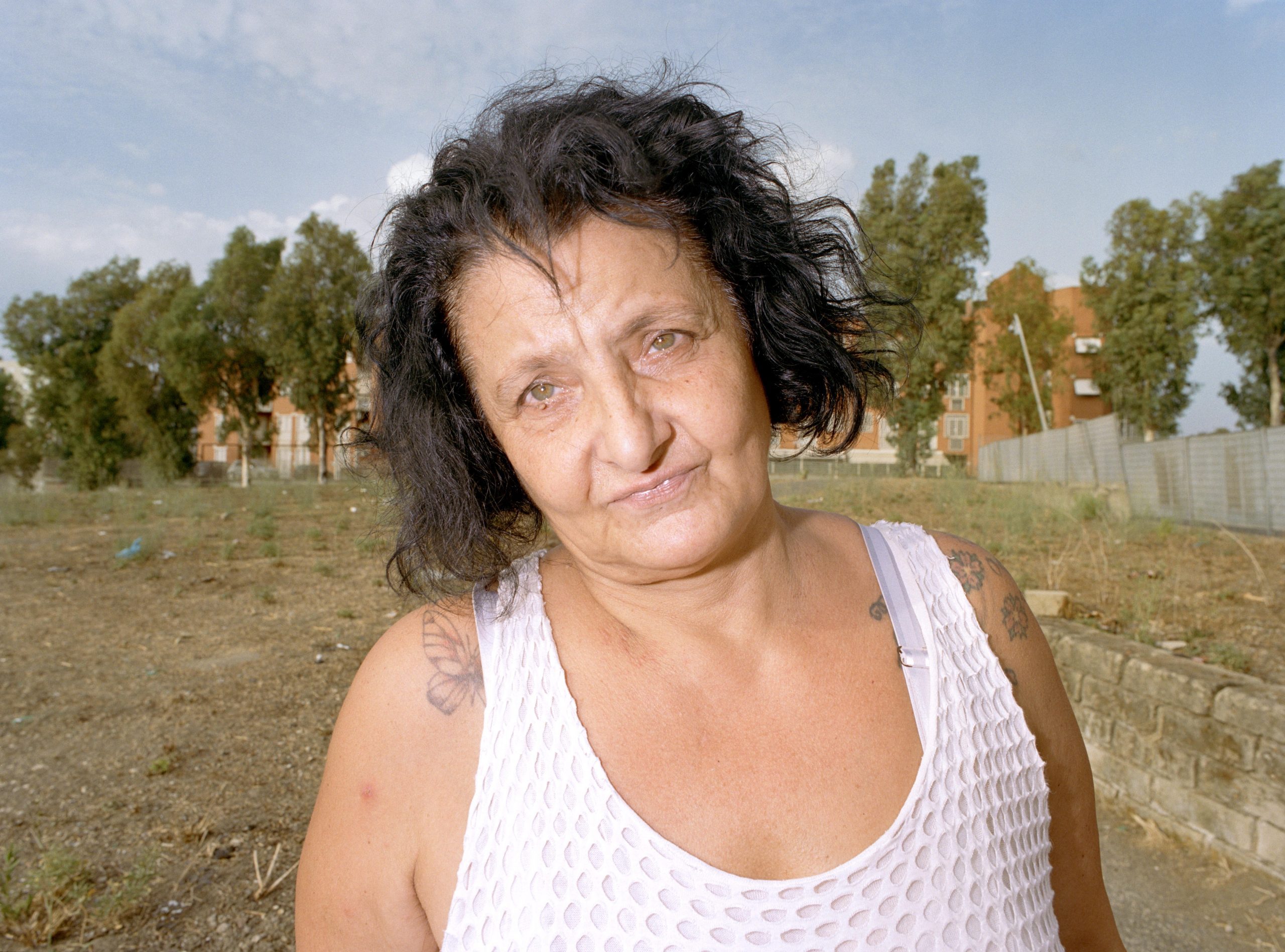 A Tor Bella Monaca ho scattato tutto l’agosto del 2024, grazie all’aiuto di Roberto e Angelo: la mia ricerca si basa sulla scoperta del territorio attraverso l’osservazione di chi la vive. È sempre una ricerca, non un indagine: non devo scoprire nulla. Ho trovato gente molto disponibile, un quartiere molto autentico, che si confronta spesso con povertà, disagio e problemi di varia natura. Ho avuto la fortuna di conoscere il gruppo di persone che gestisce il parco giochi di Adelandia. Un centro di smistamento di aiuti per le famiglie, di cibo, vestiti e giochi. Si fanno un culo pazzesco. Hanno un forte senso di comunità e i loro aiuti sono spesso fondamentali. Mi fa impazzire che, specialmente l’estate, il supermercato Pewex è il centro del mondo, specialmente nelle ore più calde. Stavo pensando a un piccolo spin-off di Tor Bella e chiamarlo Twink Pewex.