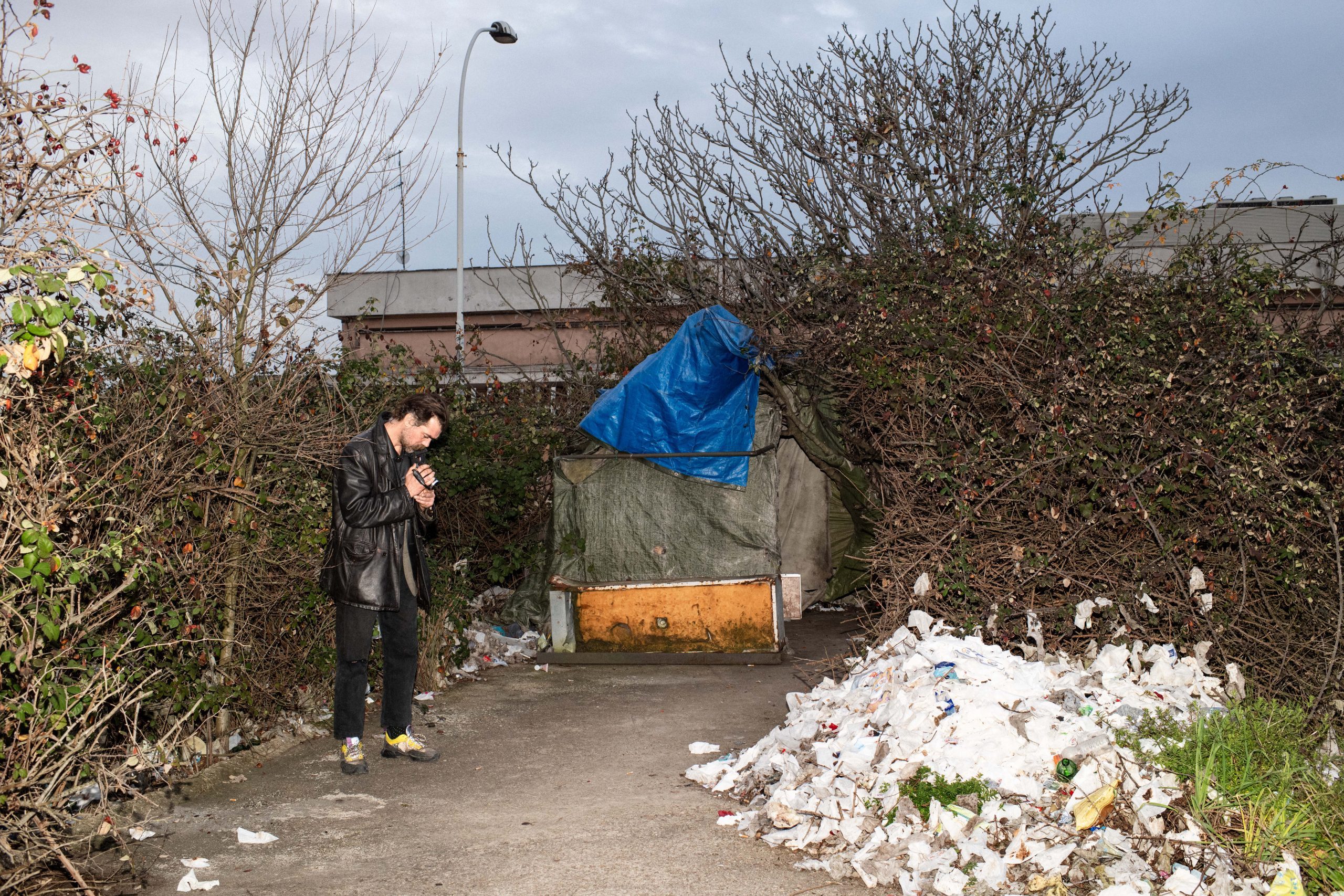 Come ti dicevo prima, ho girato spesso per Roma senza una meta fissa, per farmi risucchiare dalle strade con la speranza di trovare qualcosa. A volte le cose accadono seguendo una pista, per una questione di fiuto. A volte capitano per bucio di culo. Avevo notato più volte le prostitute di Via Longoni e mi ero affacciato timidamente. Con il tempo le ho conosciute meglio e ho cominciato a fare i primi scatti. Il materiale che avevo raccolto non mi soddisfaceva, aveva un sapore troppo da reportage. Così ho provato a mischiare un po’ le carte. Ad esempio, ho creato un paio di foto immaginandomi una situazione un po’ surreale, come la foto sul muretto in cui ci sono anche io, Gabriele e le ragazze. Ci sta anche uno strano ragazzo che passava di li per caso. La vera svolta nella ricerca però è iniziata quando ho avuto l’intuizione di dare a Jessica una macchinetta usa e getta per fotografare la sua vita, i paesaggi e i clienti. Il risultato è stato perfetto! Così sono andato avanti per più di un anno raccogliendo un totale di dieci macchinette usa e getta e una lunga intervista drammatica di Jessica che ripercorre le varie fasi della sua vita. L’intervista è stata registrata sempre in via Longoni, vicino al muretto, nell’agosto del 2024.