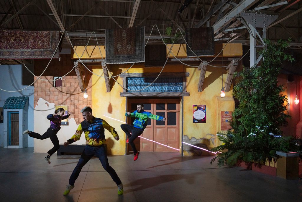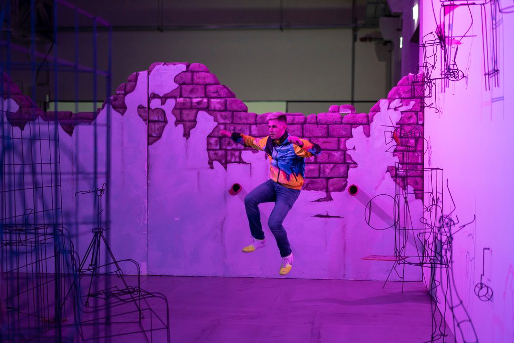 Quando abbiamo iniziato a lavorare insieme i social media come Facebook e YouTube stavano crescendo moltissimo e ogni volta che vedevamo qualcosa di strano, inusuale o che attirava la nostra attenzione, lo condividevamo tra noi. Siamo convinti che in un collettivo si debba creare una sorta di memoria comune e per farlo ogni componente del gruppo deve cercare di guardare gli stessi film, leggere gli stessi libri, e andare alle medesime mostre. Così abbiamo scoperto un sacco di cose tra cui il Jump Style, abbiamo iniziato ad approfondirlo, scoprendo che è uno stile di ballo proveniente dagli anni ’90 che ha avuto un revival negli anni 2000, insomma uno stile che, nonostante fosse già fuori moda, grazie a internet ha trovato una nuova vita. La cosa interessante è che è un movimento nato in Olanda e in Belgio che si è successivamente diffuso in Italia, e poi in Europa dell’est, per poi diventare super famoso in Australia e in Malesia neanche dieci anni fa. Quindi questo stile rappresenta in un certo senso il ritardo delle informazioni che, come per la metafora del sasso gettato nello stagno, si diffonde in modo concentrico. Abbiamo poi indagato il Jump Style perché ci interessa su tre livelli. Innanzitutto perché intercetta vari aspetti a noi cari come la musica hardcore, che è simile alla tekno e quindi caratterizzata da alti bpm, che ci piaceva anche da puri spettatori o da ballare. In secondo piano perché i ballerini si filmano sempre mentre danzano, mettendo in scena loro stessi spesso attraverso modalità teatrali, utilizzando l’architettura che li circonda. E il terzo motivo per cui ci interessa il Jump Style, è che questi ballerini sono prevalentemente autodidatti. Quindi persone che hanno imparato lo stile prettamente grazie a YouTube e ai suoi tutorial, a rappresentazione del fatto che viviamo nell’era in cui possiamo imparare attraverso i social network dei movimenti densi di significato, senza mai entrare in diretto contatto con una determinata cultura.