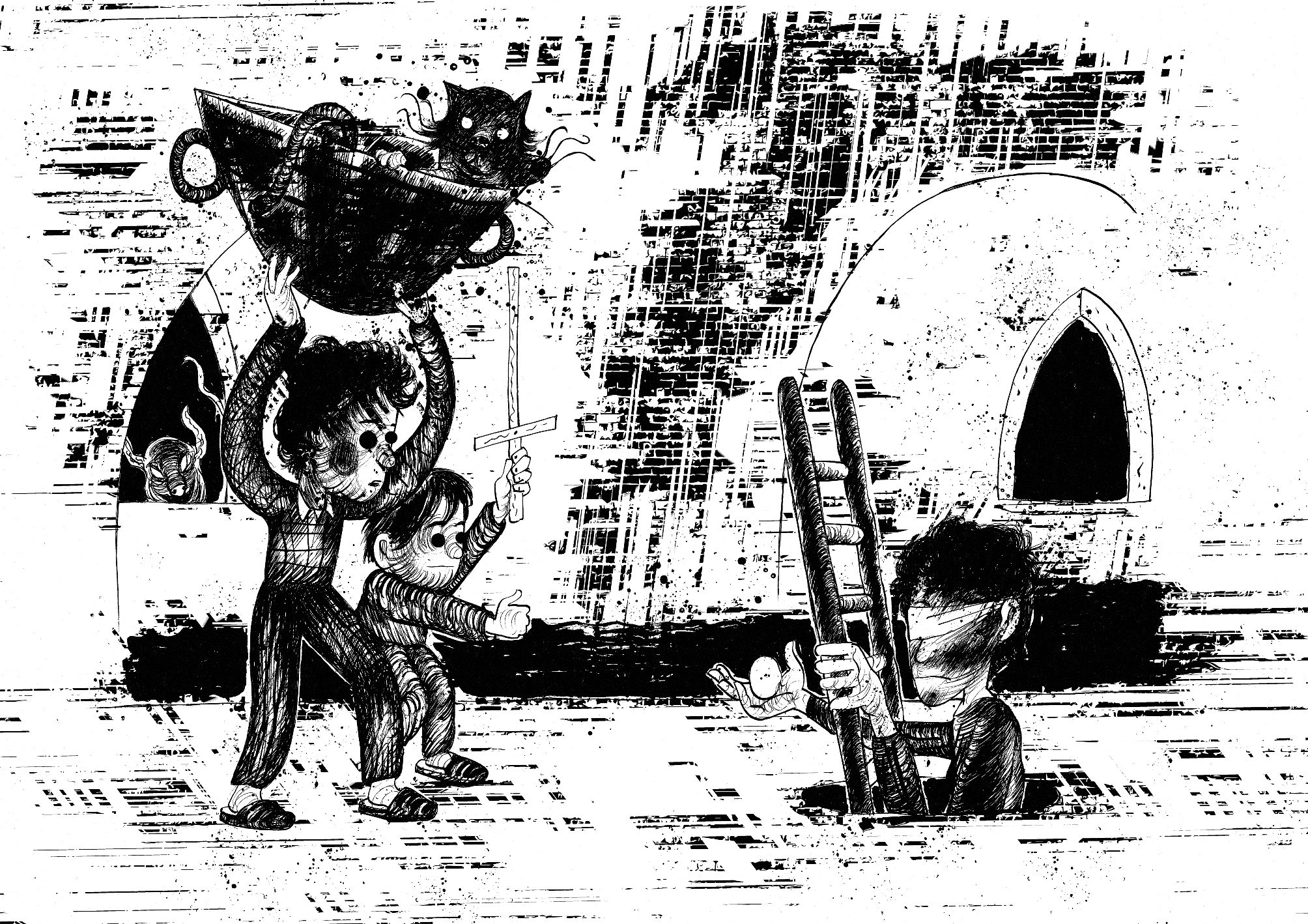 Come ti dicevo, l’Iran è sempre stato un paese in mezzo ai conflitti, dalla Persia Antica fino alla Secondo Guerra Mondiale. Nessuno sa quanti milioni di persone in Iran sono morte di miseria e di povertà causata dalla guerra mondiale. Parliamo di un paese che non faceva parte di quella guerra. Mia nonna quel periodo l’aveva vissuto e me l’ha raccontato. Io invece sono nato in mezzo a una guerra che è durata otto anni e ha influenzato tutta la mia vita già da piccolo. E poi i mille conflitti sociali e politici risalenti a 40 anni prima magari, ma che comunque hanno avuto un peso sulla mia crescita. Quindi, noi iraniani nasciamo sotto il peso dei problemi e moriamo seppelliti dentro ai conflitti. Allo stesso tempo siamo nati in un paese grande che gode di una grande storia, arte, letteratura, architettura, musica, filosofie, religioni ecc., ma anche quelle non sono sempre e necessariamente un vantaggio! Io sono iraniano e vorrei continuare a esserlo, anche disegnando sono iraniano, sono consapevole di ciò che mi ha magari arricchito mentalmente, artisticamente oppure culturalmente e, lontano da qualsiasi tipo di nazionalismo, posso dire che godo di ciò che mi ha regalato l’Iran. Ma non posso chiudere gli occhi davanti a ciò che paghiamo amaramente a causa di questa ricchezza culturale. C’è comunque qualcosa da criticare dentro questa ricchezza, una ricchezza pesante che ho provato a rappresentare tramite quella coperta. Ma non è facile: o devi liberarti di quella coperta, o devi restare lì sotto a godere della sua parte buona facendo finta di non sentirne il peso. Uscire fa paura, stare sotto di soffoca… e che faccio? Resto lì perché sono nato sotto una di quelle coperte, letteralmente! Ma cerco di farmi anche spazio da lì sotto. Di liberarmi, almeno per avere le mani libere e gli occhi che possono guardare all’esterno.