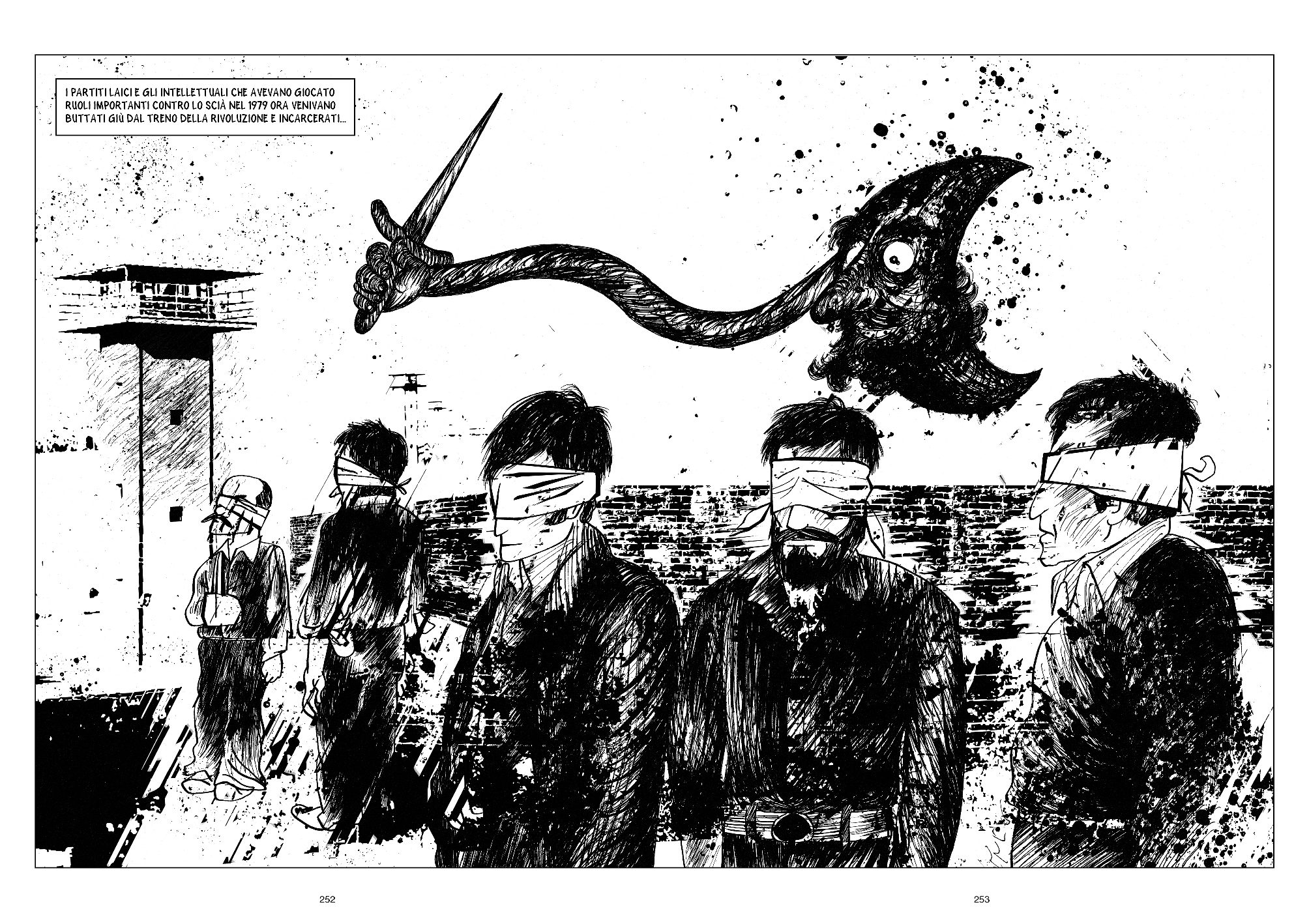 Tanti di noi iraniani all’estero viviamo un grande senso di colpa per essere lontani in momenti del genere. Ma, solo per il fatto di essere iraniani residenti all’estero (anche se non facciamo nulla contro il regime), rischieremmo di essere subito arrestati se tornassimo in Iran quando la tensione nelle strade è alta. Quindi, dicevo, per un lungo periodo ho smesso di disegnare, in certi momenti ero in totale crisi, paralizzato dalla situazione, pensando agli amici e conoscenti che rischiavano la vita, quindi il libro non è andato avanti. Ero costretto a stare qui, provando a dare un minimo contributo a chi si sacrifica per la libertà. Quando ho ricominciato a lavorare al libro le notizie delle manifestazioni dei sei mesi precedenti mi avevano talmente influenzato che ho deciso di cambiare alcune cose di quel capitolo non ancora concluso, inserendo degli elementi più attuali sui movimenti sociali iraniani. La copertina per esempio. C’erano molte prove già pronte, ma alla fine abbiamo deciso di usare quel disegno che rappresenta le donne iraniane protagoniste dell’ultima fase della rivolta in Iran (donne che sono sempre state protagoniste nella battaglia contro l’ignoranza e il regime). Per questi cambiamenti devo anche ringraziare Canicola che mi ha lasciato libero di decidere, oltre a curare in modo prezioso il fumetto.