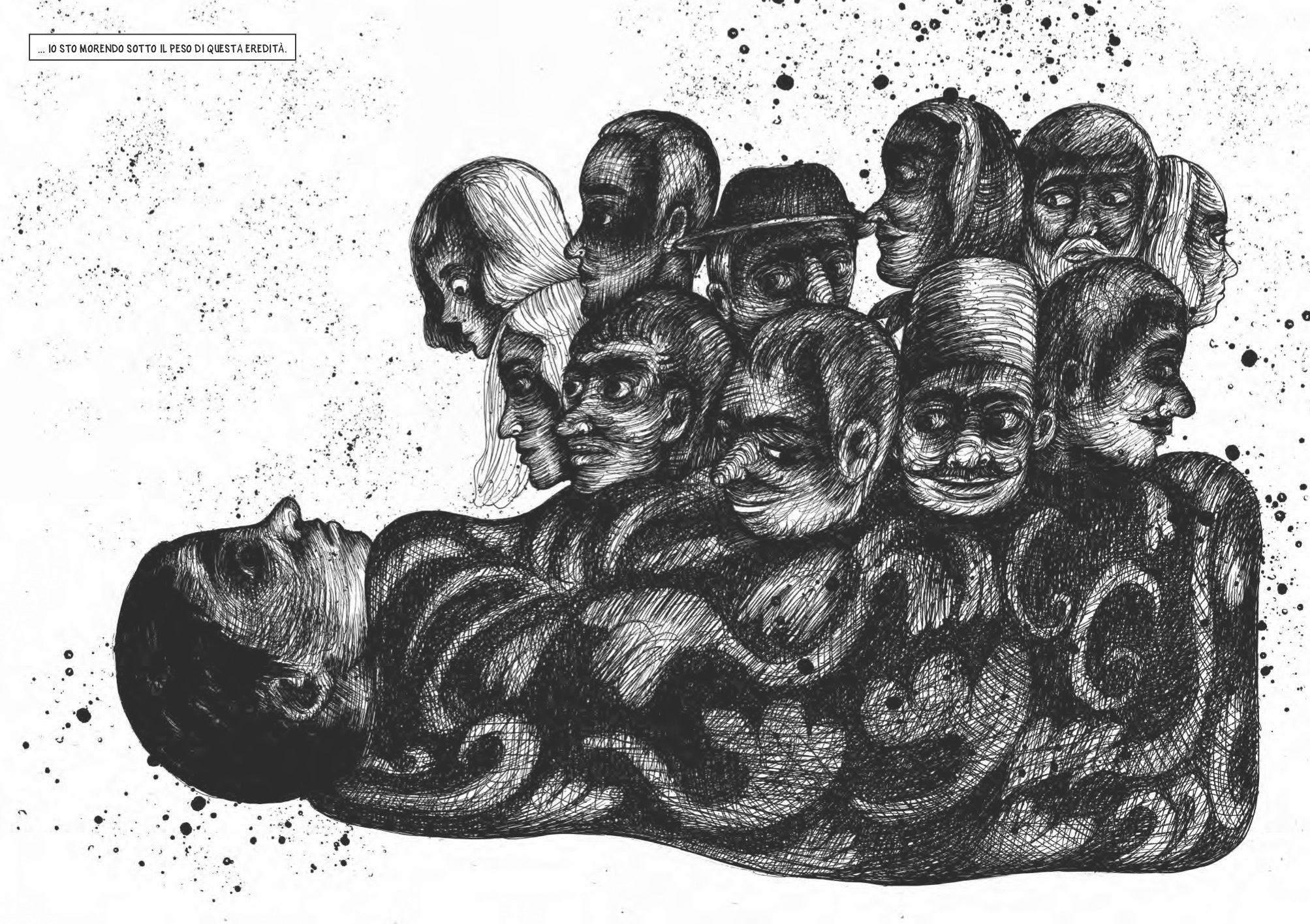 A un certo punto del libro, mentre ripercorri la storia familiare di una coperta, c’è un’illustrazione bellissima e la frase “io sto morendo sotto il peso di questa eredità”. È staccata dal resto, potrebbe immagino vivere anche da sola fuori dal libro. Cosa intendevi esprimere con quell’immagine?