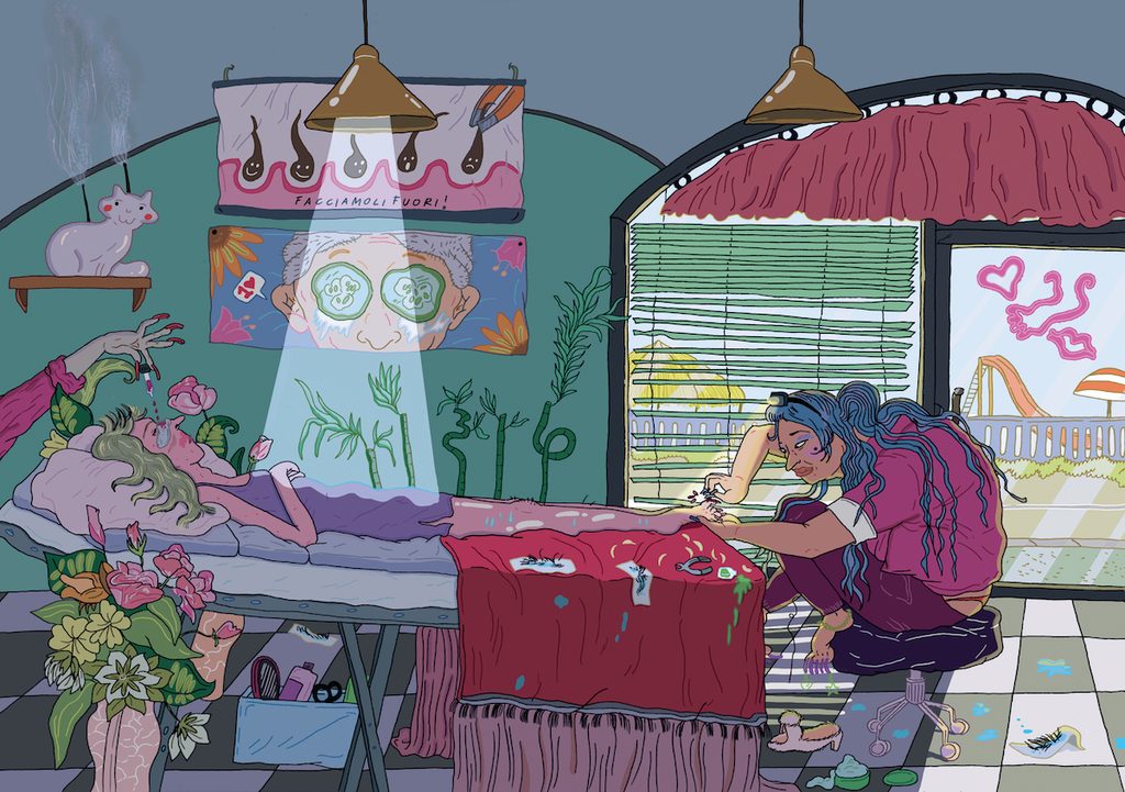 I personaggi di Martina Sarritzu, cesenate classe 1992, li riconosci subito. Non solo per il tratto, ormai inconfondibile, ma perché attraggono e repellono allo stesso tempo, proprio come certe assurdità che Martina indaga da sempre con sguardo antropologico, divertito e disturbante. Tutto nel suo immaginario nasce dalla Romagna, almeno quella che ha vissuto prima sulla propria pelle, poi da adulta con sguardo più maturo e distaccato: il kitsch, il corpo, il desiderio, l’adolescenza, l’imbarazzo delle prime volte, l’esagerazione e tutto il tragicomico umano.