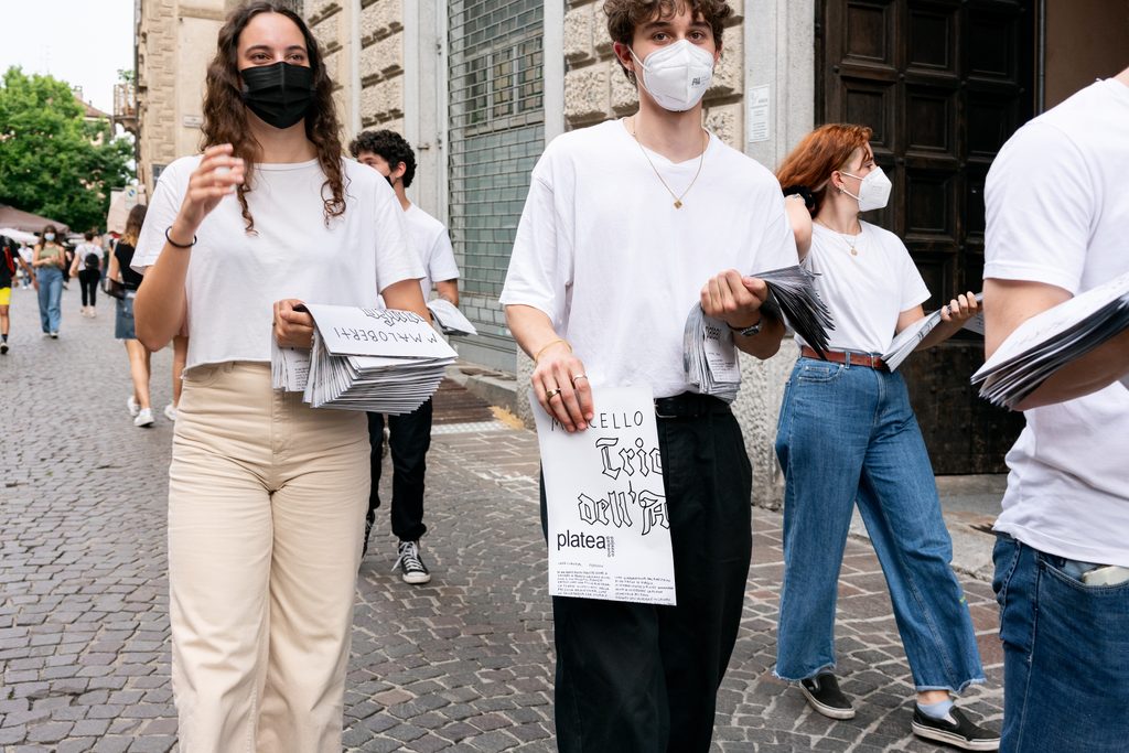 Il 9 giugno 2021 abbiamo fatto la prima presentazione: durante il mese di maggio, per tre settimane, è stato esposto nella vetrina soltanto un cubo illuminato con la scritta Platea, che ha creato molta curiosità. Poi il giorno dell’inaugurazione Marcello Maloberti ha preso 16 studenti della NABA e li ha coinvolti nella distribuzione di questi manifesti 70×100, che da allora vengono prodotti per ogni mostra, con la foto della vetrina da un lato e un testo esplicativo dall’altro. I ragazzi li hanno distribuiti a chiunque passasse fino a spingersi in piazza e ancora oltre. La cosa bella è che ne hanno distribuiti più di 1400, e ne abbiamo trovato per terra solo uno. Vuol dire che la gente ha apprezzato! Questi poster, il primo e quello delle mostre successive, alla fine verranno raccolti in un grande catalogo.