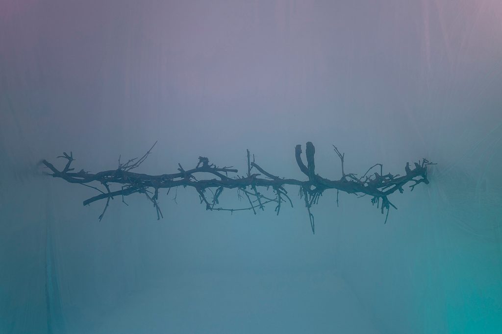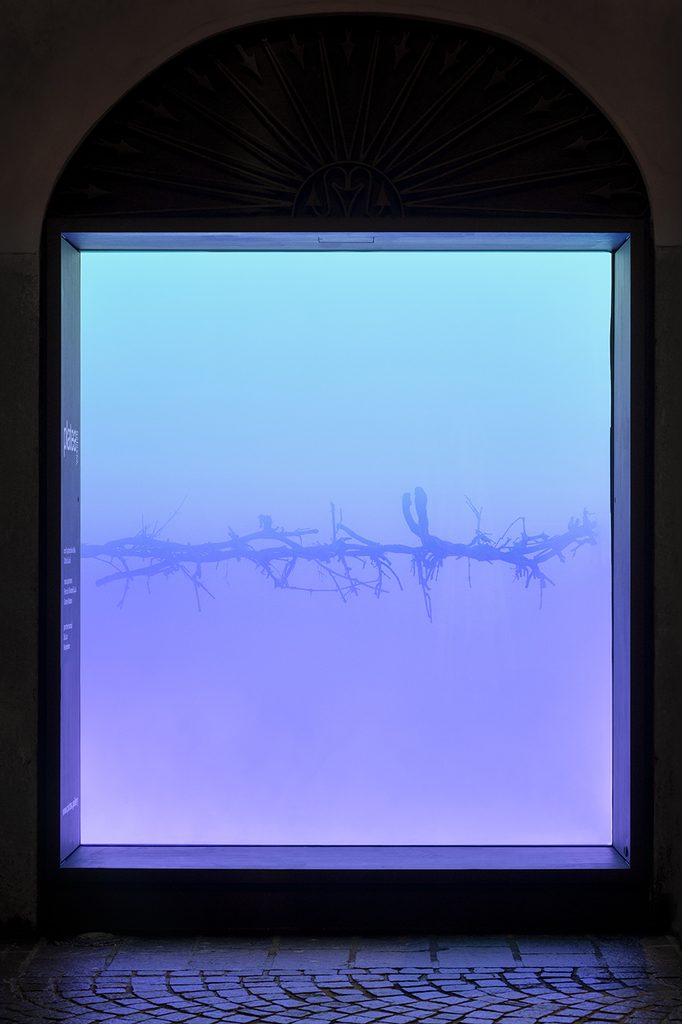 Quello di Alberonero, che vedete adesso in mostra, invece è un intervallo tra un progetto e l’altro; questi intervalli sono dedicati a un artista che si ispira al territorio in senso lato, ci piace che si rivolga al contesto lodigiano ma il progetto non deve essere locale e non deve per forza legarsi all’espressione naturalistica del luogo. Per esempio quello che vedete oggi è un tralcio di vite di sangiovese emiliano, perciò ha poco a che fare con noi, però c’è il concetto di pianura e, quando ho incontrato Luca, stava lavorando sul vivere e condividere il paesaggio, l’ambiente, il campo, il bosco, per cui ci siamo incontrati perfettamente perché nel nostro manifesto, tra i punti da sviluppare, avevamo scelto quello della rinegoziazione del rapporto tra natura e artificio e tra natura e cultura.