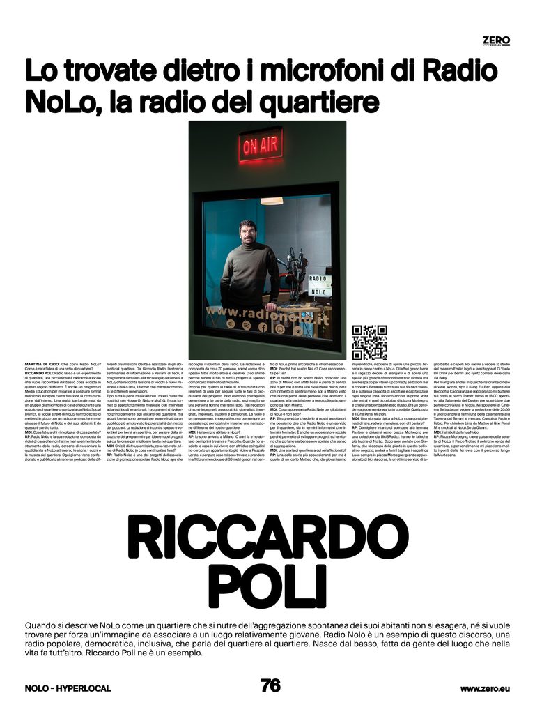 Ci spiega in queste righe come è avvenuta la nascita della Radio, qual è il suo scopo, come si incastra con la vita del quartiere e perché tutti ne possono far parte. Ci porta per mano anche alla scoperta di questa zona, indicandoci cosa fare, vedere, dove mangiare e bere in una giornata ideale. Riccardo è un nolers convinto e orgoglioso, molto attivo a livello locale per farsi portavoce di idee nate dalla community allo scopo di portare un miglioramento nella vita del quartiere.