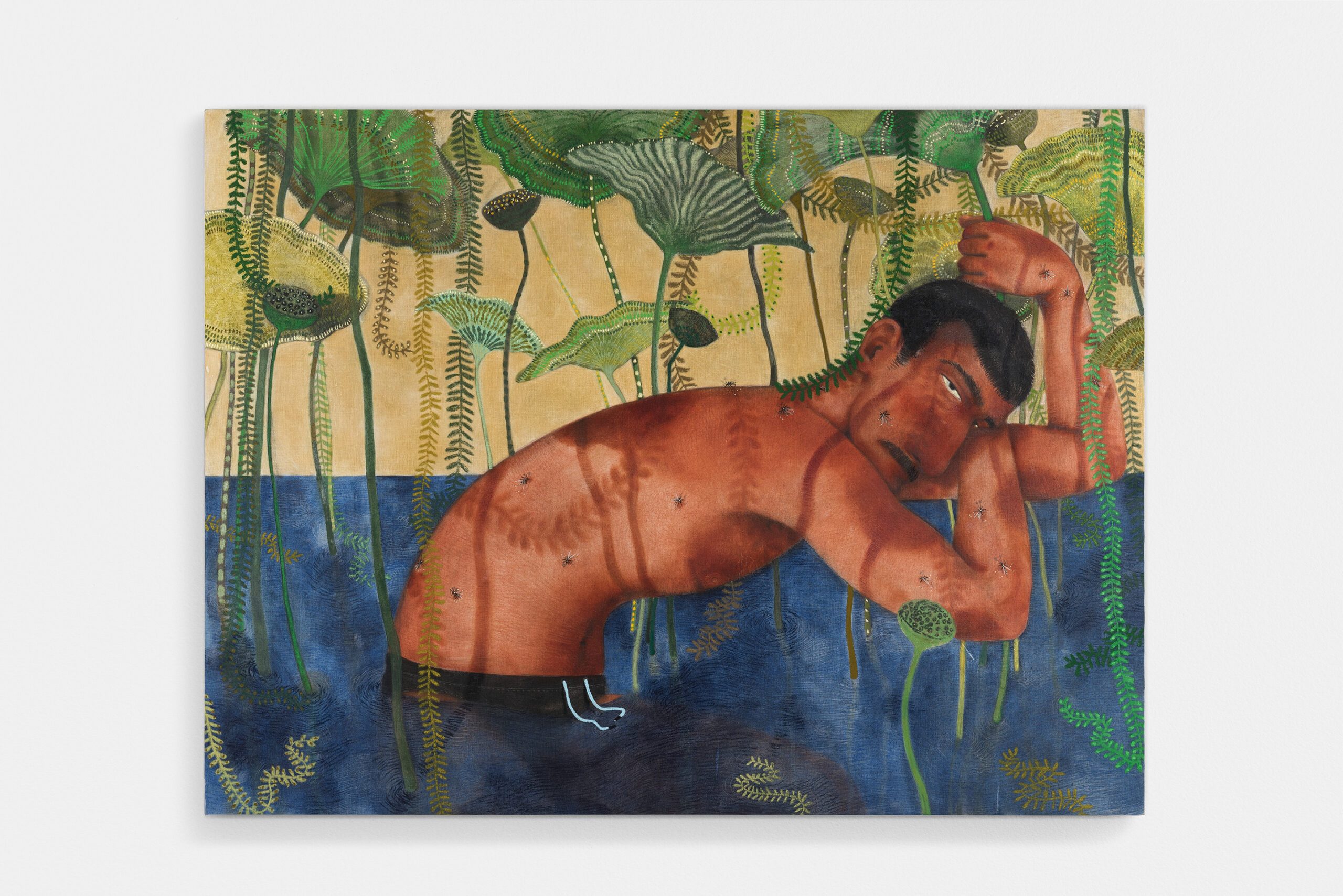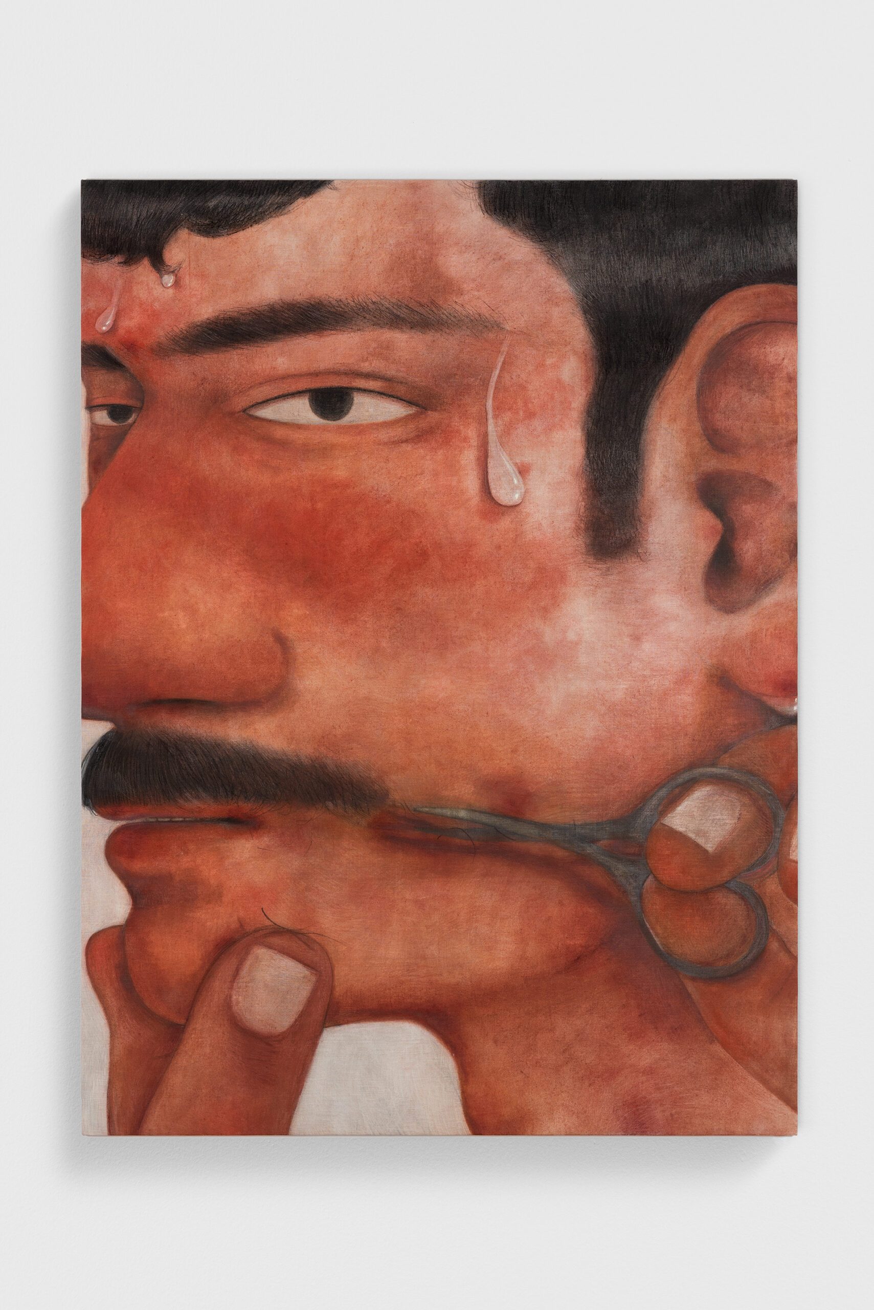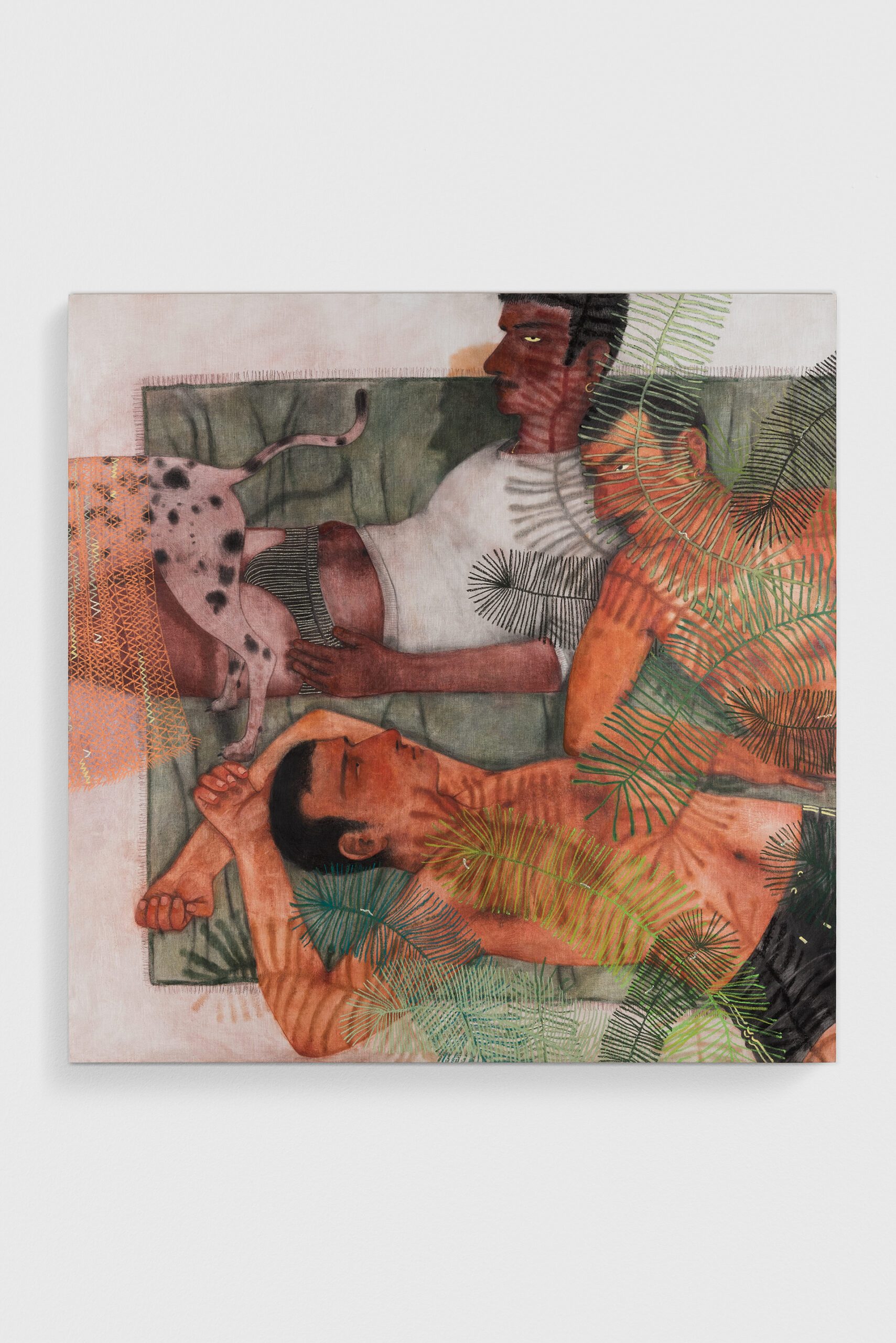 Le figure sono sempre degli autoritratti, degli alter ego. Dipingo a encausto, mescolando cera e pigmenti direttamente sulla tela, intervengo poi con pastelli di pigmento pressato per i punti più carichi di colore o con degli oli per ombre e chiaroscuri. I personaggi che dipingo hanno le mie caratteristiche fisionomiche da mediterraneo, appunto. Figure paonazze, scottate dal sole, con i capelli nero corvino, baffi: tutti miei caratteri salienti. C’è una forte materialità nei miei lavori che non passa in secondo piano rispetto ai soggetti che tratto. Rosso sanguigna e nero carboncino sono i materiali primordiali con cui l’uomo si è interfacciato. Sono colori ricorrenti nella cultura greco-romana, mio importante riferimento: ad esempio le figure dei vasi greci hanno il rosso e il nero, che riporto anche nei miei quadri. Inoltre il soggetto ricorrente dei miei lavori è declinato in maniera più o meno erotica, sensuale. Il pelo ad esempio è un elemento sia erotico che sensibile legato a una certa tipologia di tatto. Sto giocando molto con delle figure naturali legate al mio ambiente natale – il sud Italia – e anche gli elementi naturali che vado a inserire sono sempre ricercati per suggestionare sensazioni tattili o olfattive, come quelle più istintive e legate alla memoria. La pelle, ad esempio, la uso come una cartina tornasole per cercare di capire la resa delle diverse vibrazioni in pittura.