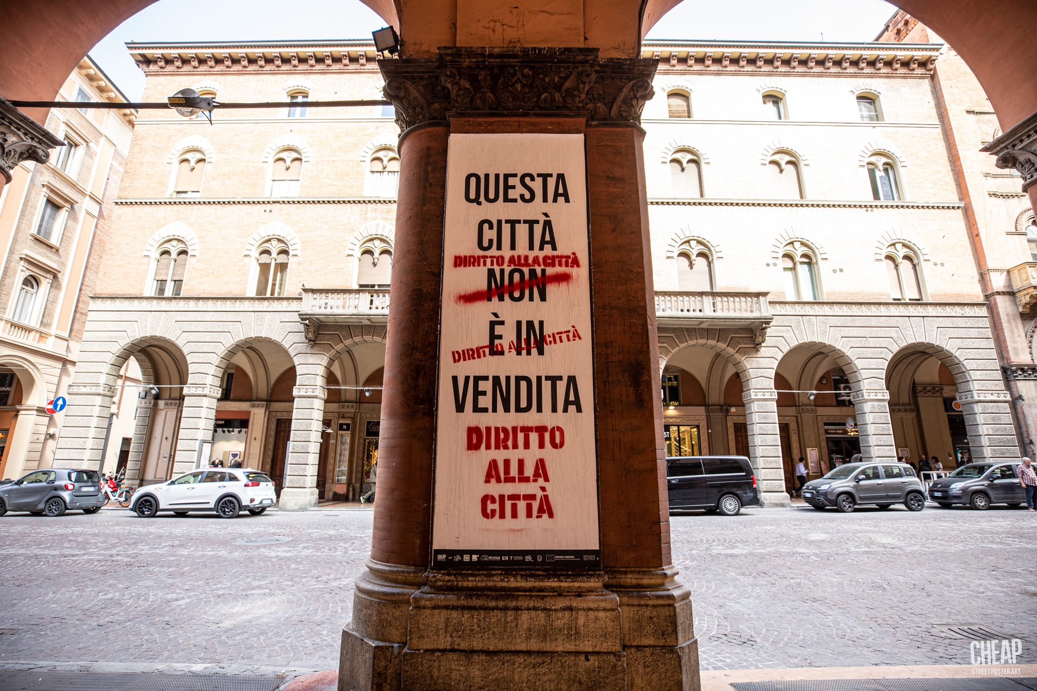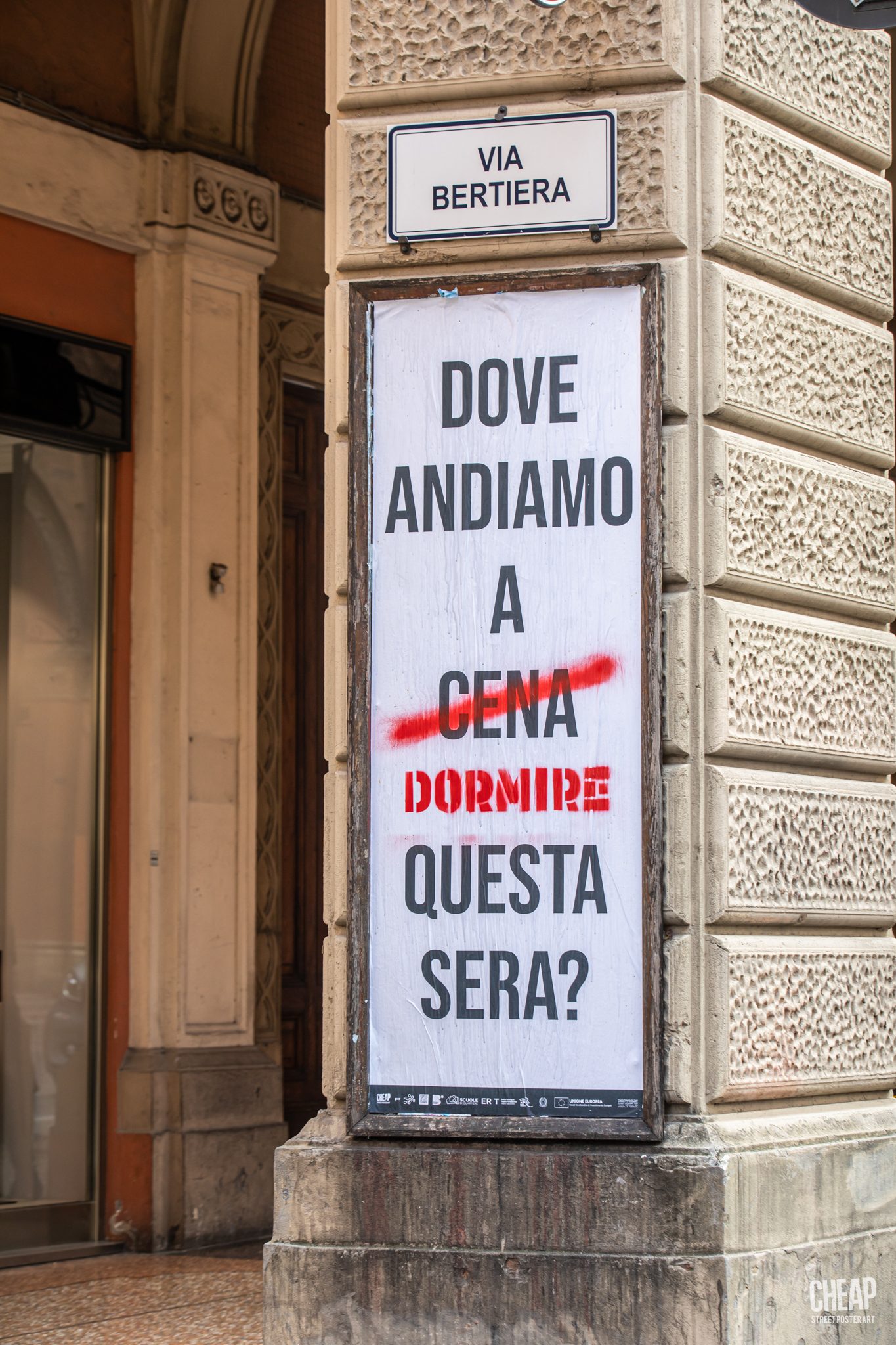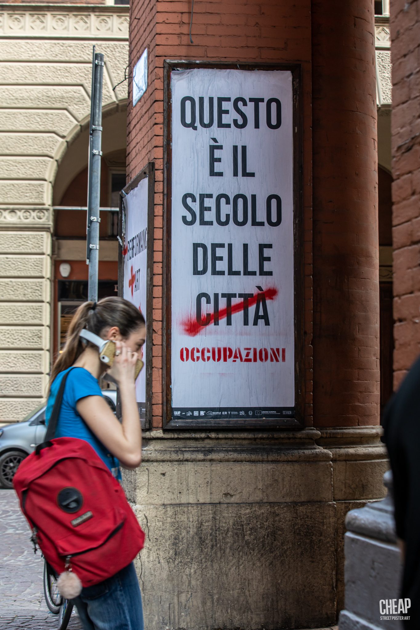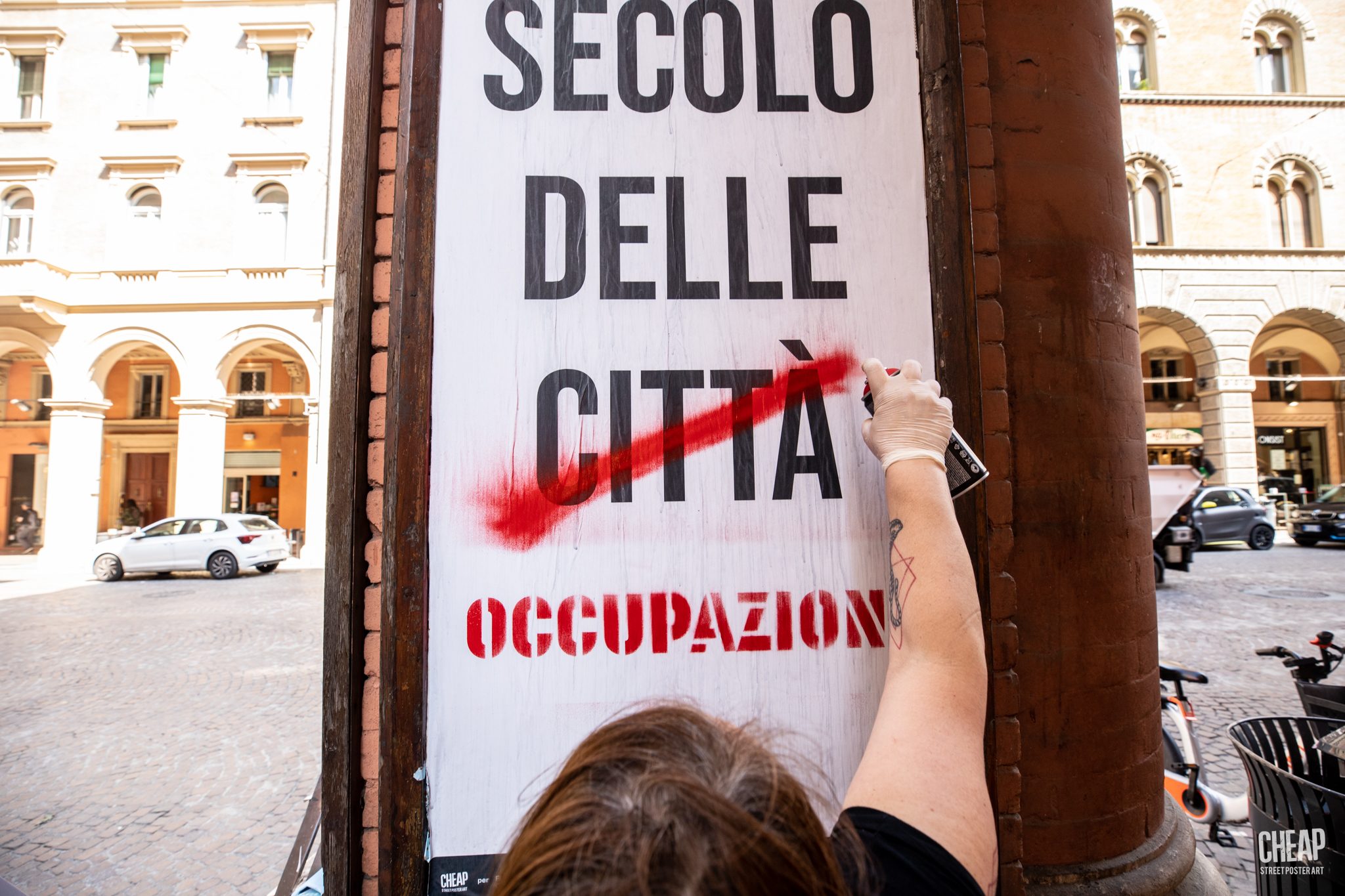 Gli scorsi giorni CHEAP ha affisso sulle bacheche di via Indipendenza una distesa di poster, successivamente crossati a bomboletta (rossa) e stencil con i testi modificati, nella tipica modalità della guerriglia controculturale nota come adbusting.