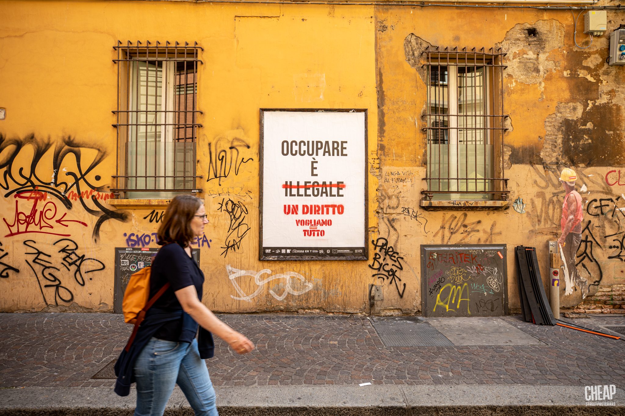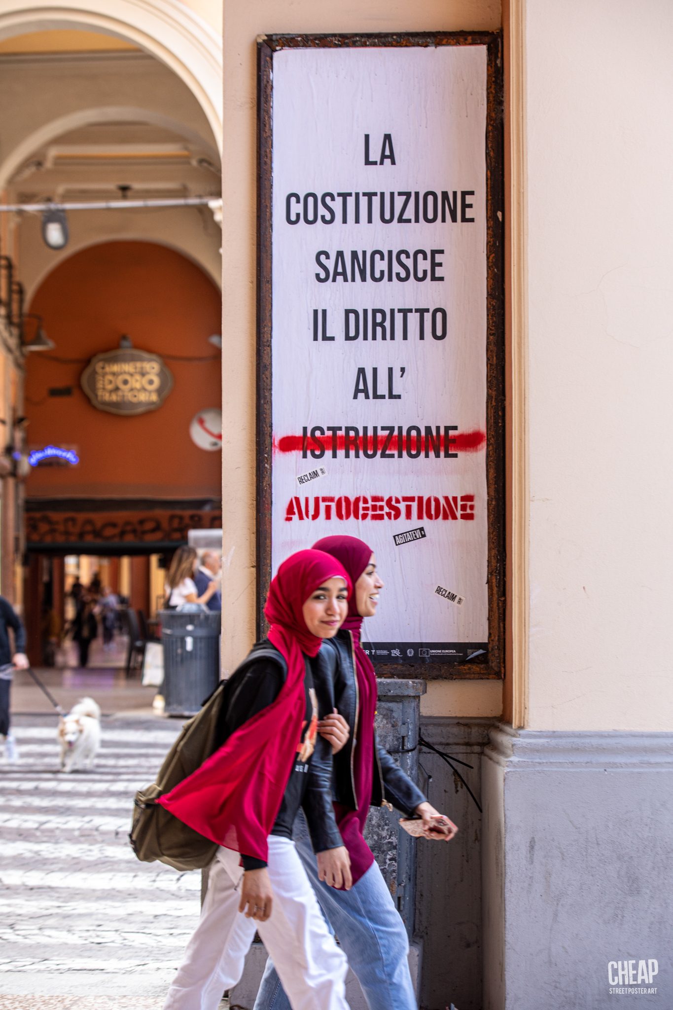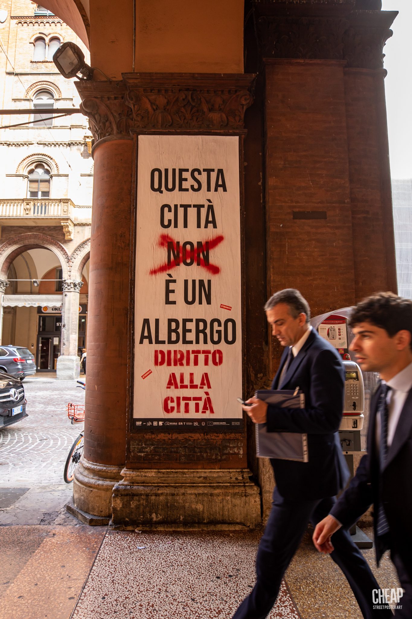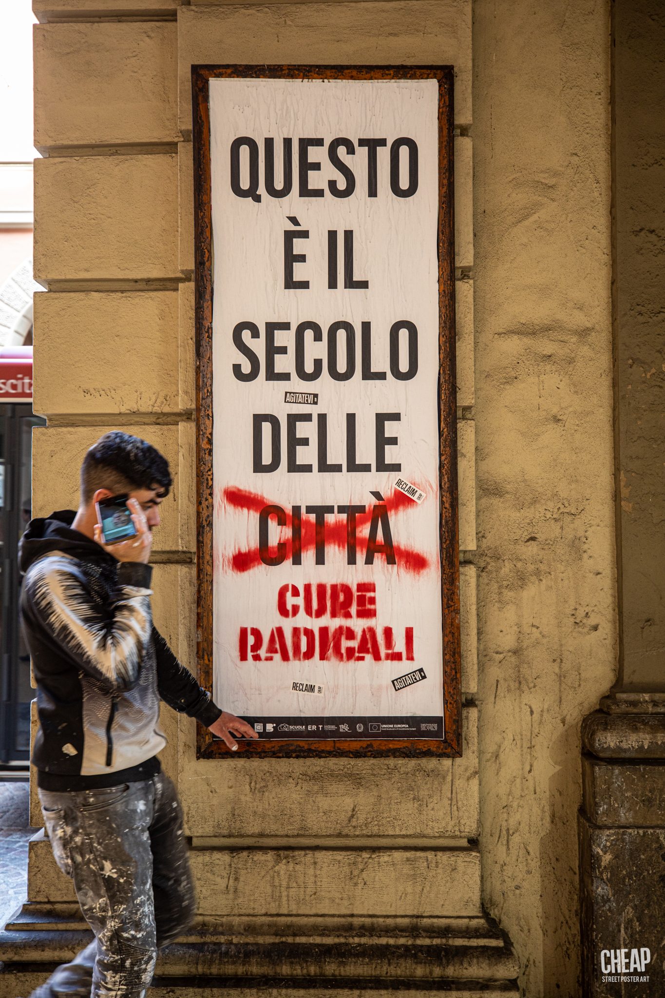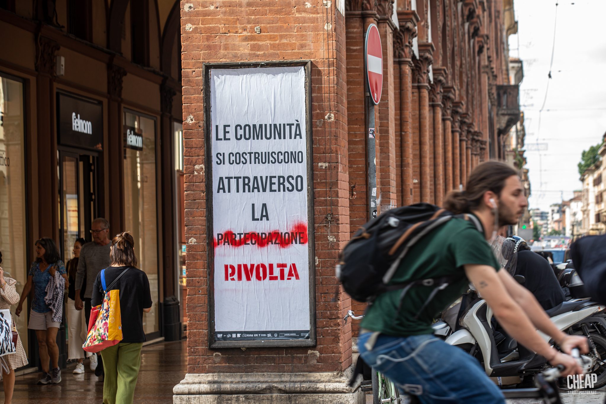 Gli scorsi giorni CHEAP ha affisso sulle bacheche di via Indipendenza una distesa di poster, successivamente crossati a bomboletta (rossa) e stencil con i testi modificati, nella tipica modalità della guerriglia controculturale nota come adbusting.